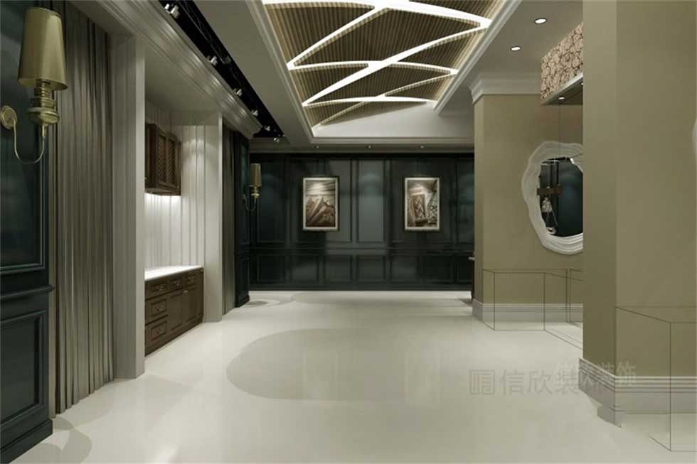 頂面通過斜坡式的周邊頂方式,和其他區(qū)域做了一個(gè)區(qū)分,使走廊看上去設(shè)計(jì)更獨(dú)特和精美,格柵木藝頂面,在燈條的分隔下,菱形的造型感,時(shí)尚而美觀大方。