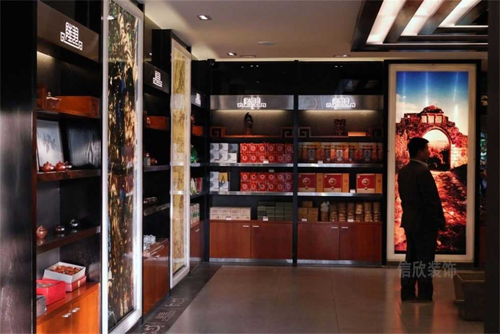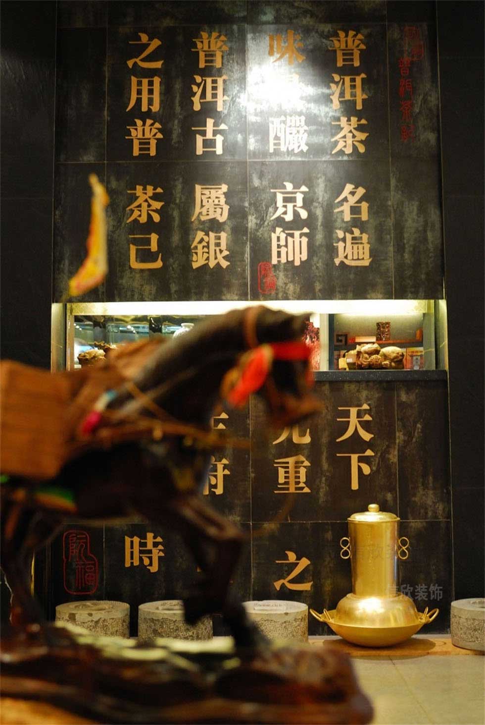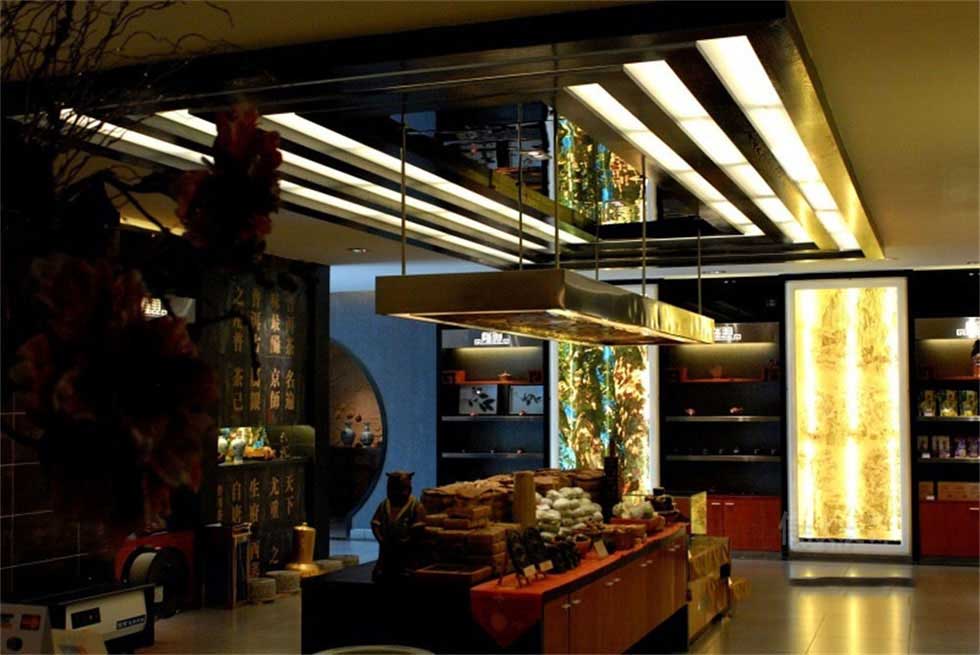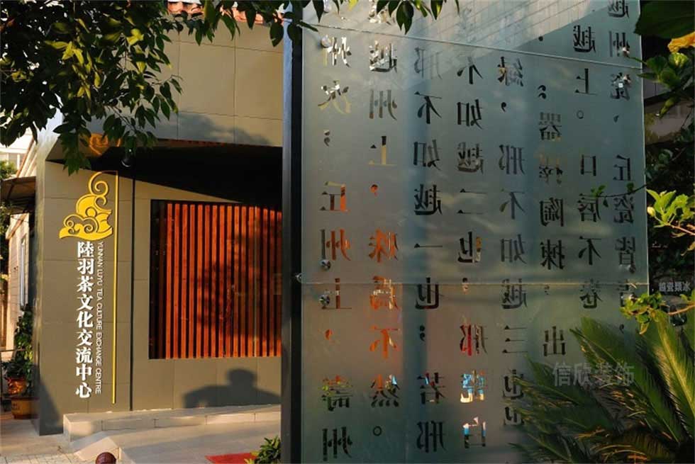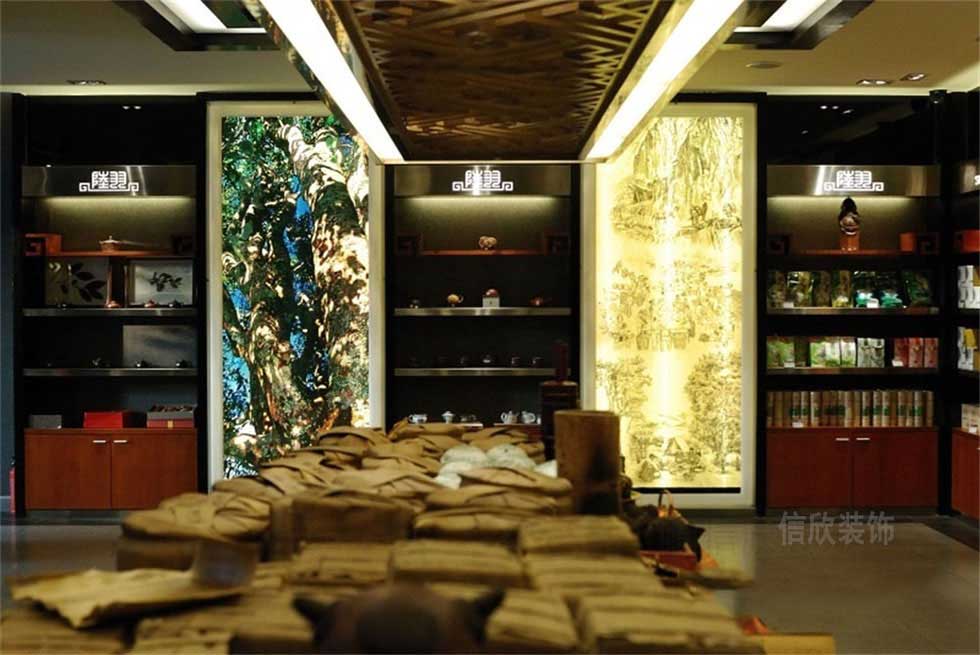 茶葉文化展廳外立面的裝修設(shè)計(jì),采用符合中華文化的灰黑色為主題,小篆書寫的LOGO一眼望去營造一種文化的氛圍,用磨砂玻璃制作的頂棚,上面加上了體現(xiàn)中式文化的書法。