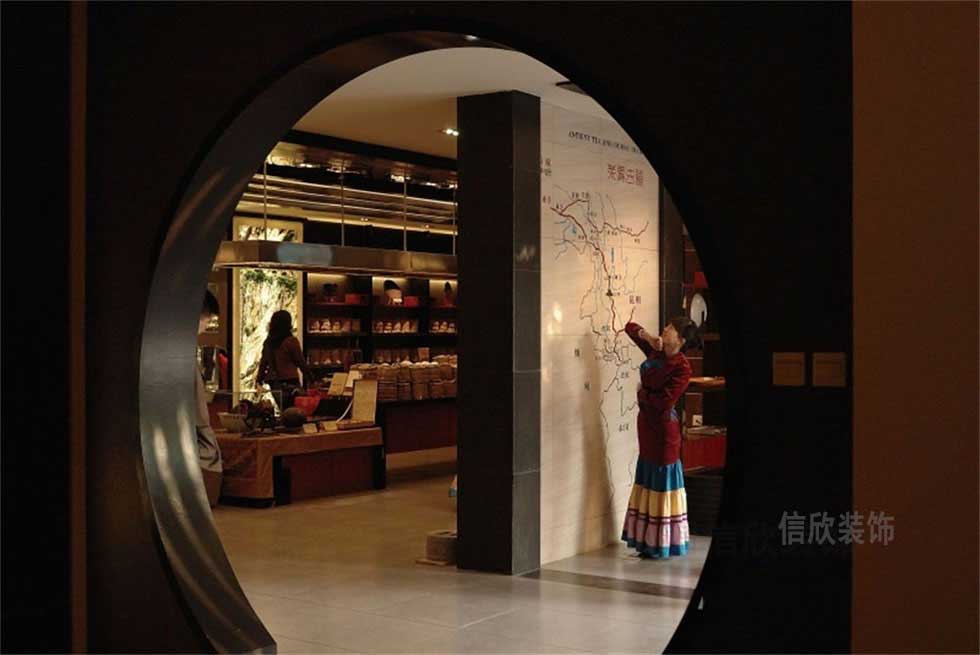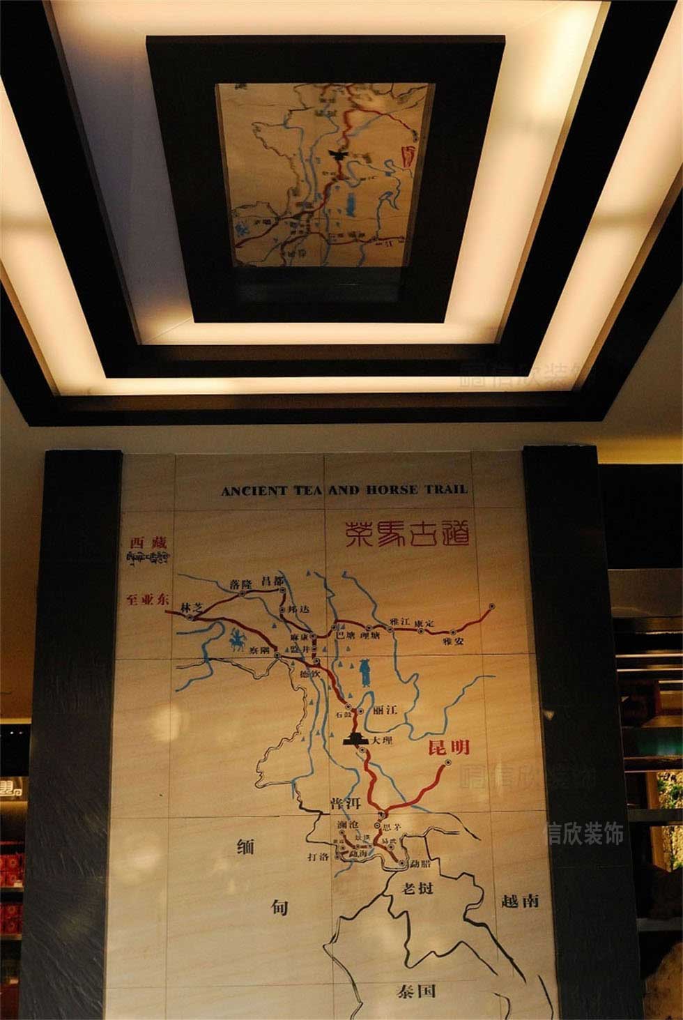 進(jìn)門的玄關(guān)用磚砌成的背景墻,上面用茶馬古道的地圖展現(xiàn)在人們面前,交代了茶的出處,讓客戶既能感受到歷史的傳承,又學(xué)習(xí)到了關(guān)于這段歷史的前世今生那古老的故事。