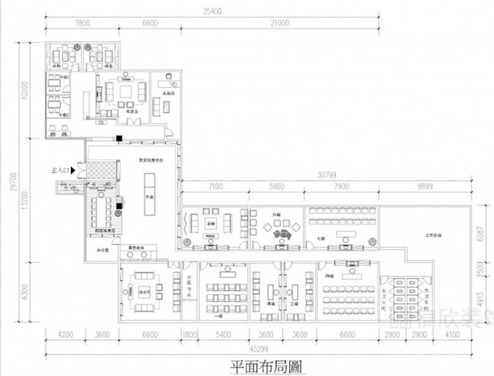 設(shè)計(jì)理念:本案是一所新中式風(fēng)格的茶葉文化展廳裝修設(shè)計(jì)案例,新中式風(fēng)格在設(shè)計(jì)上延續(xù)了明清時期家居配飾理念,提煉了其中經(jīng)典元素并加以簡化和豐富,在家具形態(tài)上更加簡潔清秀,同時又打破了傳統(tǒng)中式空間布局中等級、尊卑等文化思想,空間配色上也更為輕松自然。
