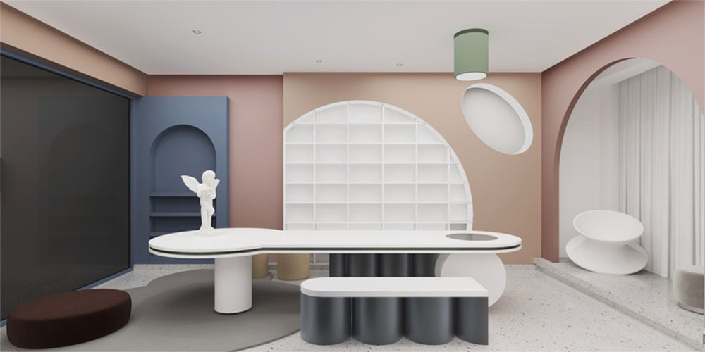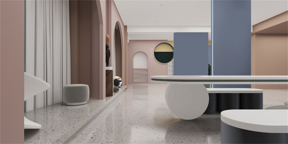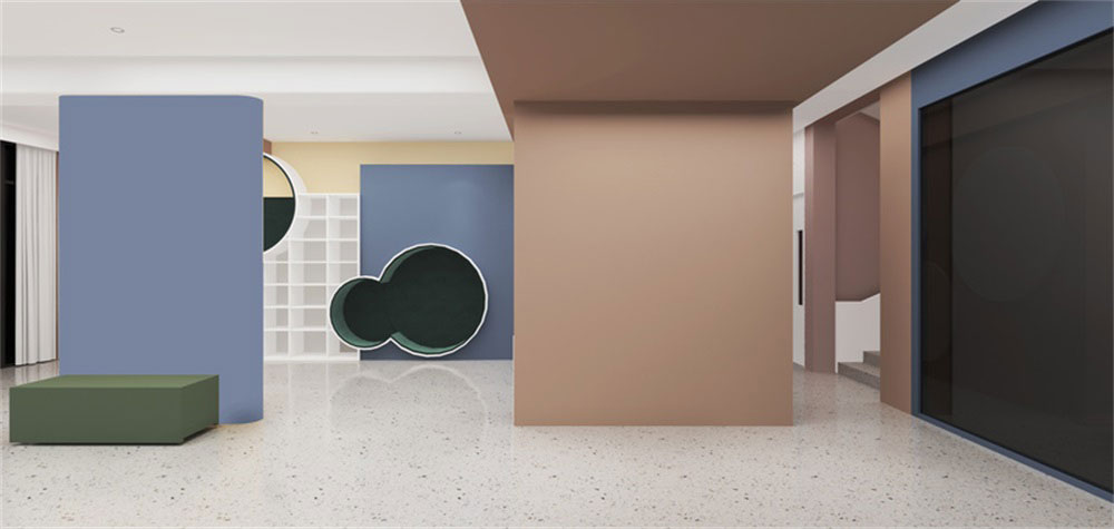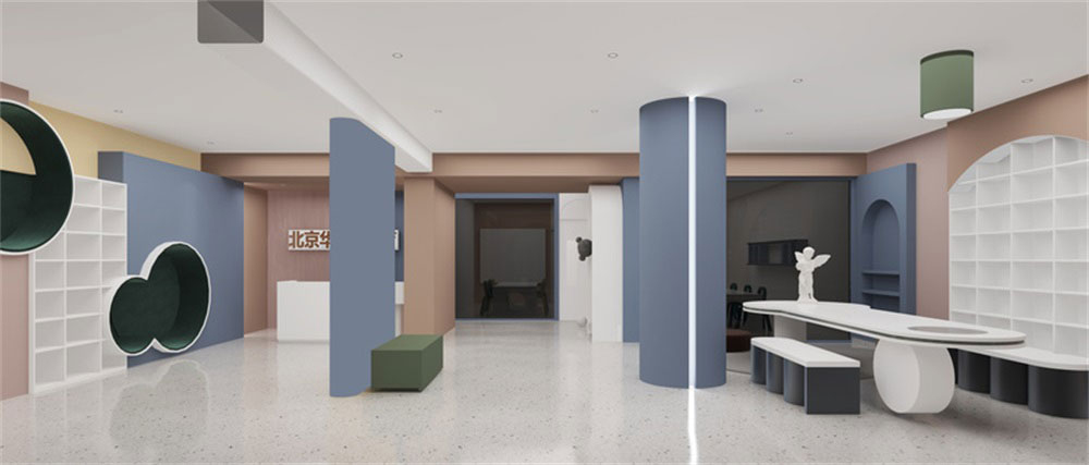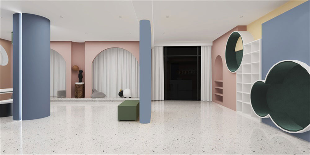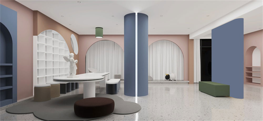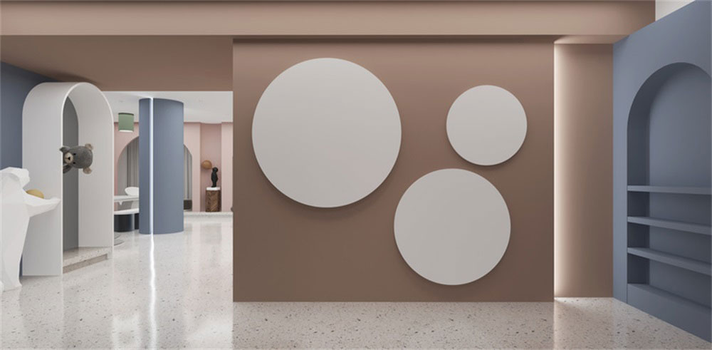 前廳的設(shè)計上,采用了半圓形拱門式的設(shè)計,更偏重于卡通的感覺,整體色彩的應(yīng)用簡單,通過朱紅色,藍色,白色的相互對比和襯托,讓整體感覺形象生動。