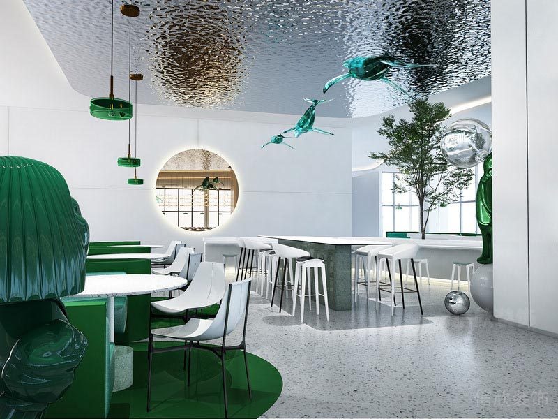 半圓形的綠色卡座,造型獨特,樣式新穎,與綠色的樹木相互應(yīng),在一片白色的世界里,形成了一抹耀眼的綠意。