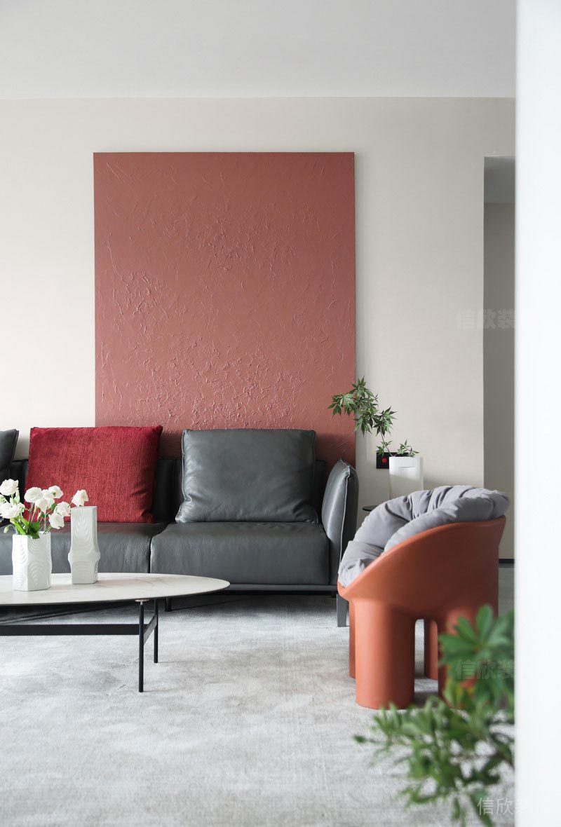 深灰色的皮質(zhì)沙發(fā),紅色的抱枕,白色的吊燈,簡(jiǎn)潔干凈