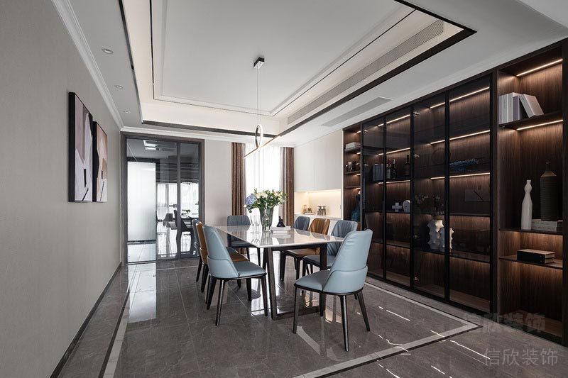 深圳市龍崗區(qū)橫崗恒地悅山湖餐廳 回形的吊頂和地面波打線,顯示出歐式藝術(shù)性的對稱美,8人座的石紋黑色不銹鋼腳宴會桌,配上皮藝,明亮通透;白色和黑色玻璃組成的餐邊柜和酒柜,點綴了貴族般的生活享受。