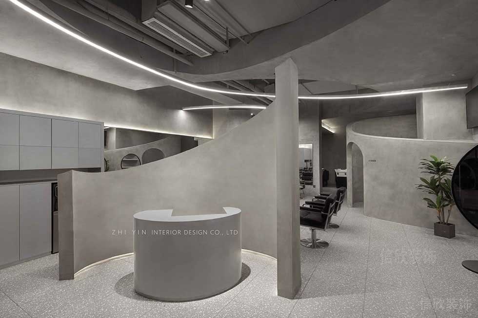洗頭區(qū)和造型區(qū)的區(qū)域分隔設計,有效的規(guī)劃了空間使用的合理性,灰色的空間造型,體現了原始工業(yè)感的簡潔與干練唯美的特性,讓顧客能夠更好的舒緩情緒,放松心情。