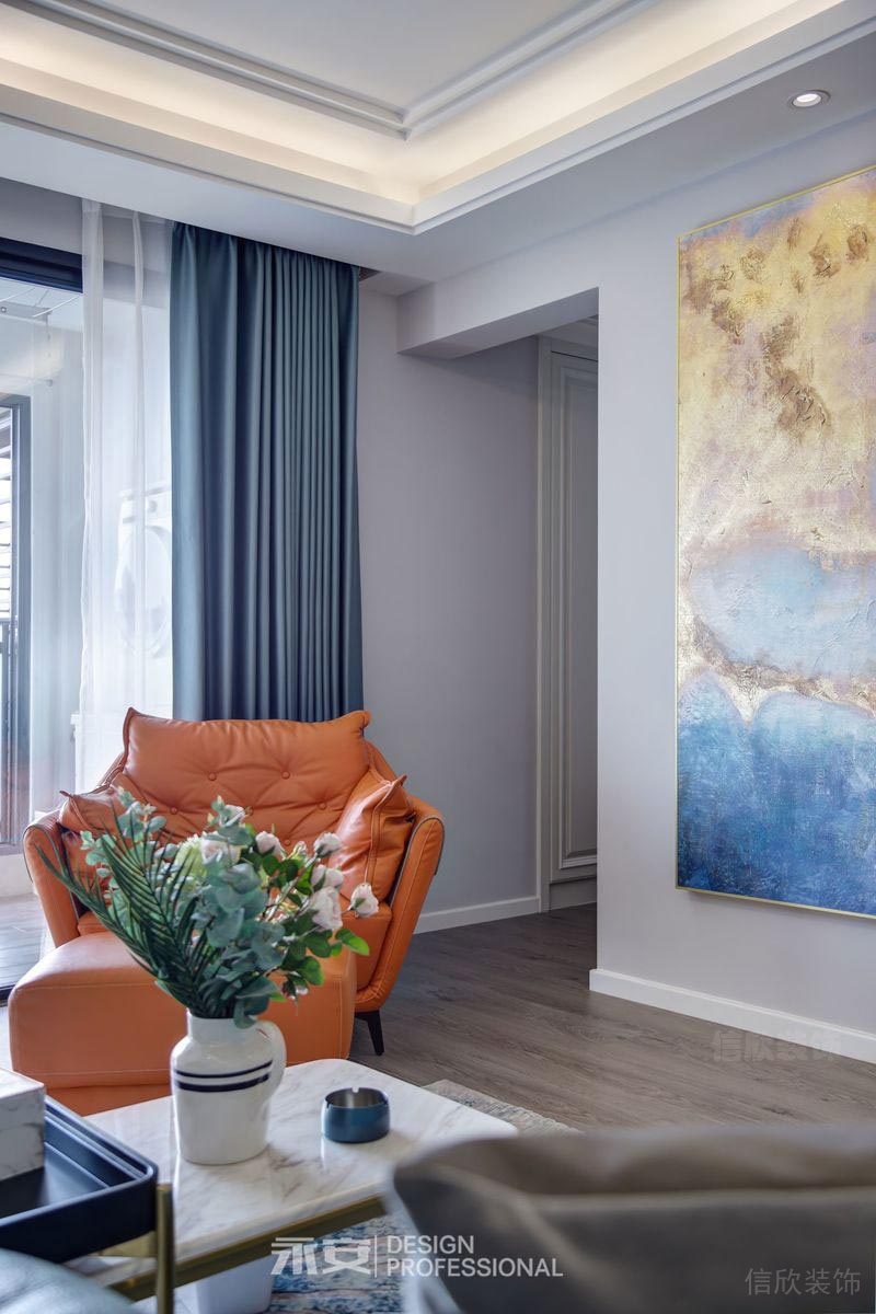 橘黃色和淺藍(lán)色的法式沙發(fā)松軟舒適,二者之間雖然色度跨度較大,但通過主題裝飾畫的映襯,明悅而又自然地從空間視野中跳躍出來,營造出都市生活的居家愜意