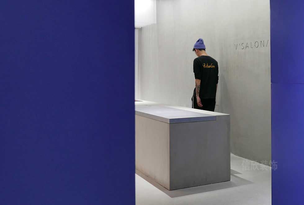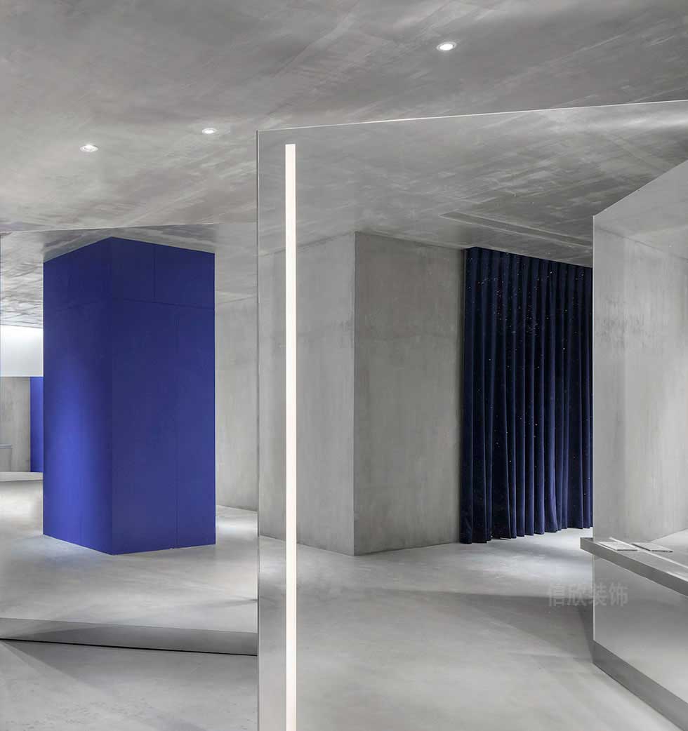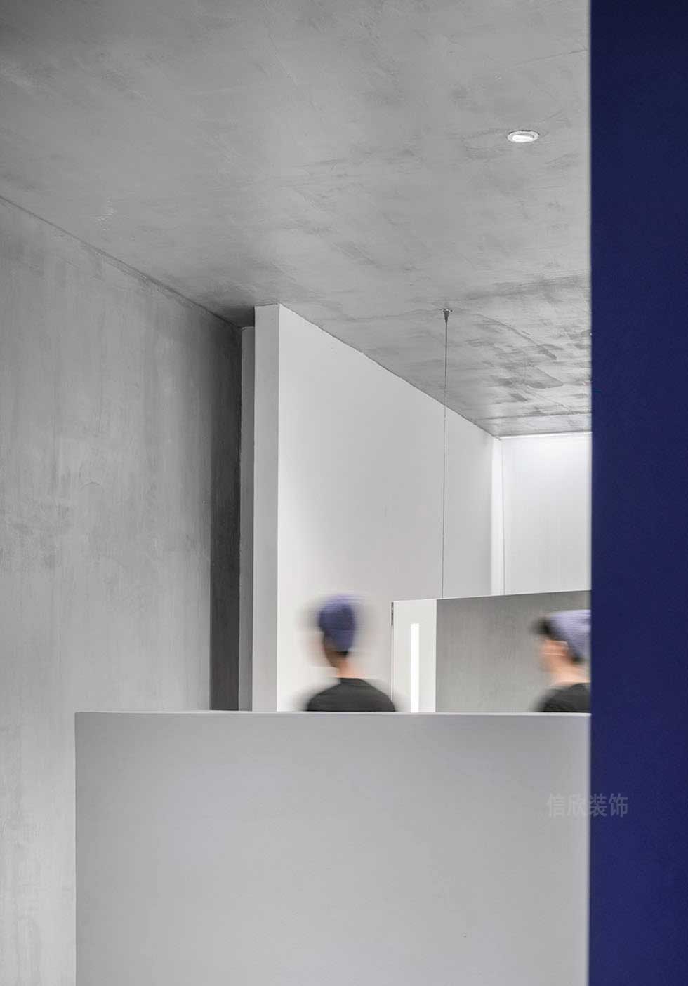 設計理念:這是一個在商場原安全通道基礎上改造的理發(fā)店。從設計到施工結(jié)束的周期大概一個月的時間,時間很短,限制很多,要求很多。不能有任何的固定隔墻,所有空間中可見的墻體都是臨時的必須可移動的。包括吧臺,鏡面,柜體都是可移動的。在有限的面積里,需要滿足員工休息區(qū),洗頭區(qū),vip護理區(qū),雜物收納間,等待區(qū),不少于12個的理發(fā)位,和足夠的收納等等。設計以塊面的穿插,鏡面的反射來趣味整個空間,藍色作為對比和跳躍,在灰白的空間中去做出打破。