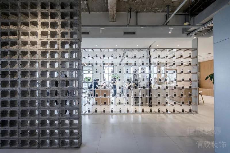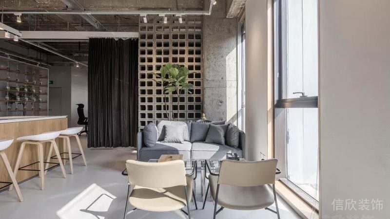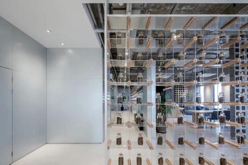 在墻面上大量使用玻璃墻,使空間的通透性強(qiáng),人們可以通過玻璃看到窗外的世界,使辦公空間與室外自然環(huán)境在一定程度上達(dá)到相互融合。同時(shí),室內(nèi)植物在陽光的照射下形成自然的光影,對辦公空間有一定裝飾性。