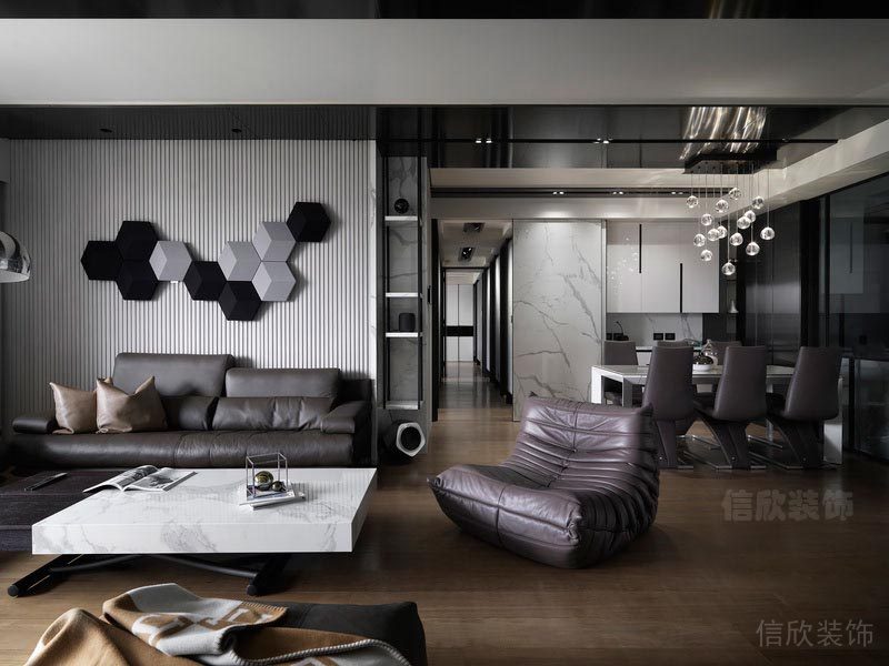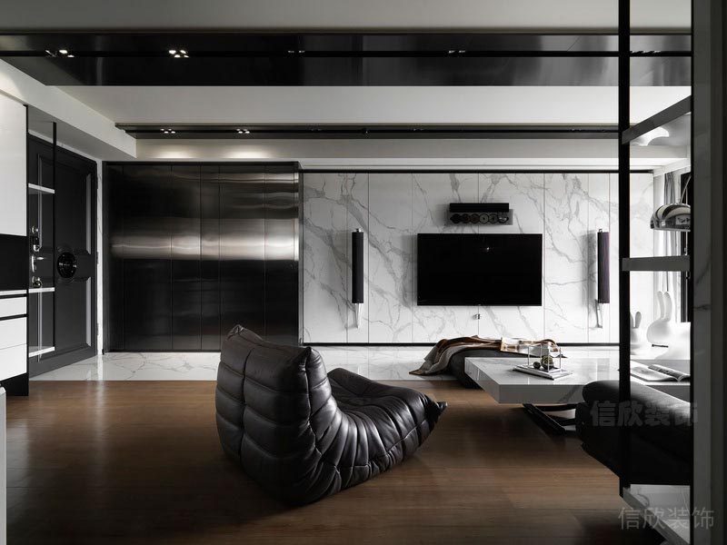 黑白灰的客廳白色石紋背景墻優(yōu)美高雅,白色的吊頂用黑色金屬線條裝點(diǎn),注重線條的提煉,搭配幾何圖形的沙發(fā)背景墻,視覺沖擊感極強(qiáng)。