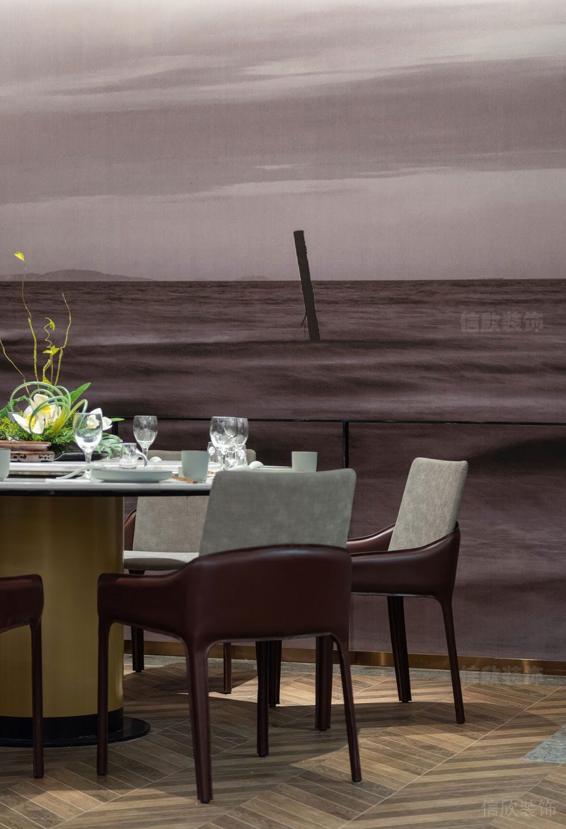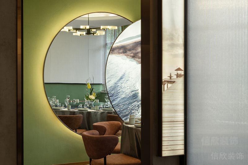 明月般的墻飾,鏡子和風景畫的結(jié)合,似乎告訴人們,人有悲歡離合,月有陰晴圓缺,此事古難全,活在當下,珍惜此時此刻的相聚時光。