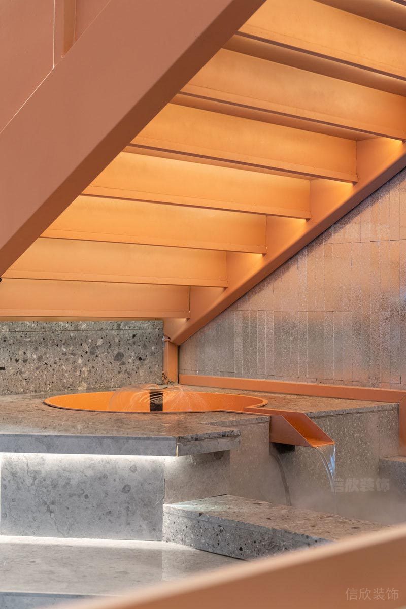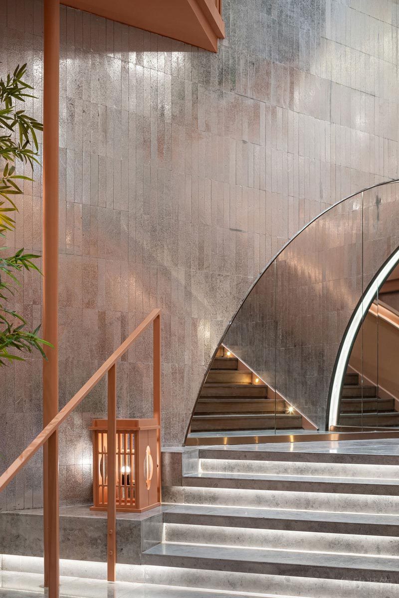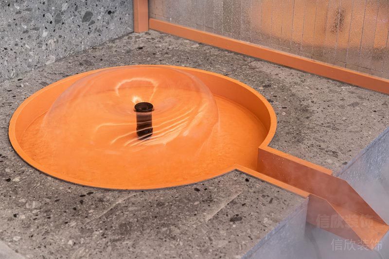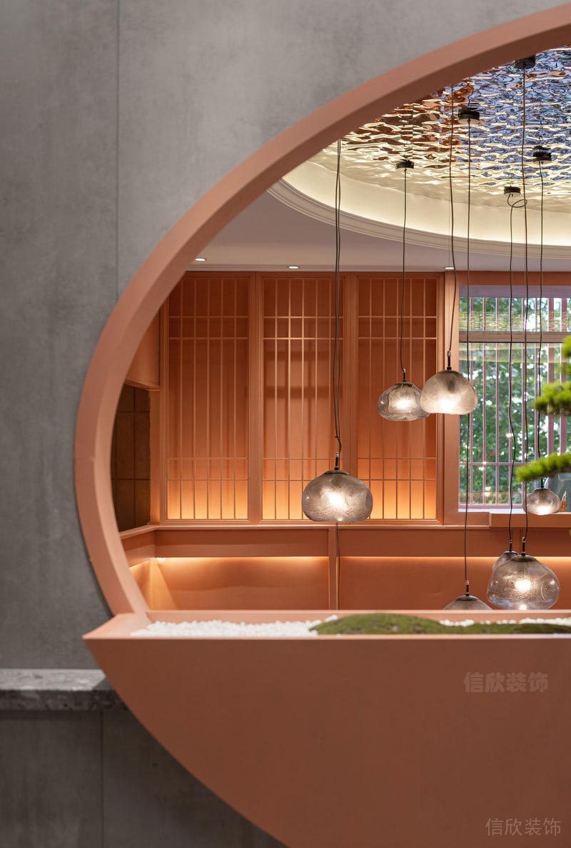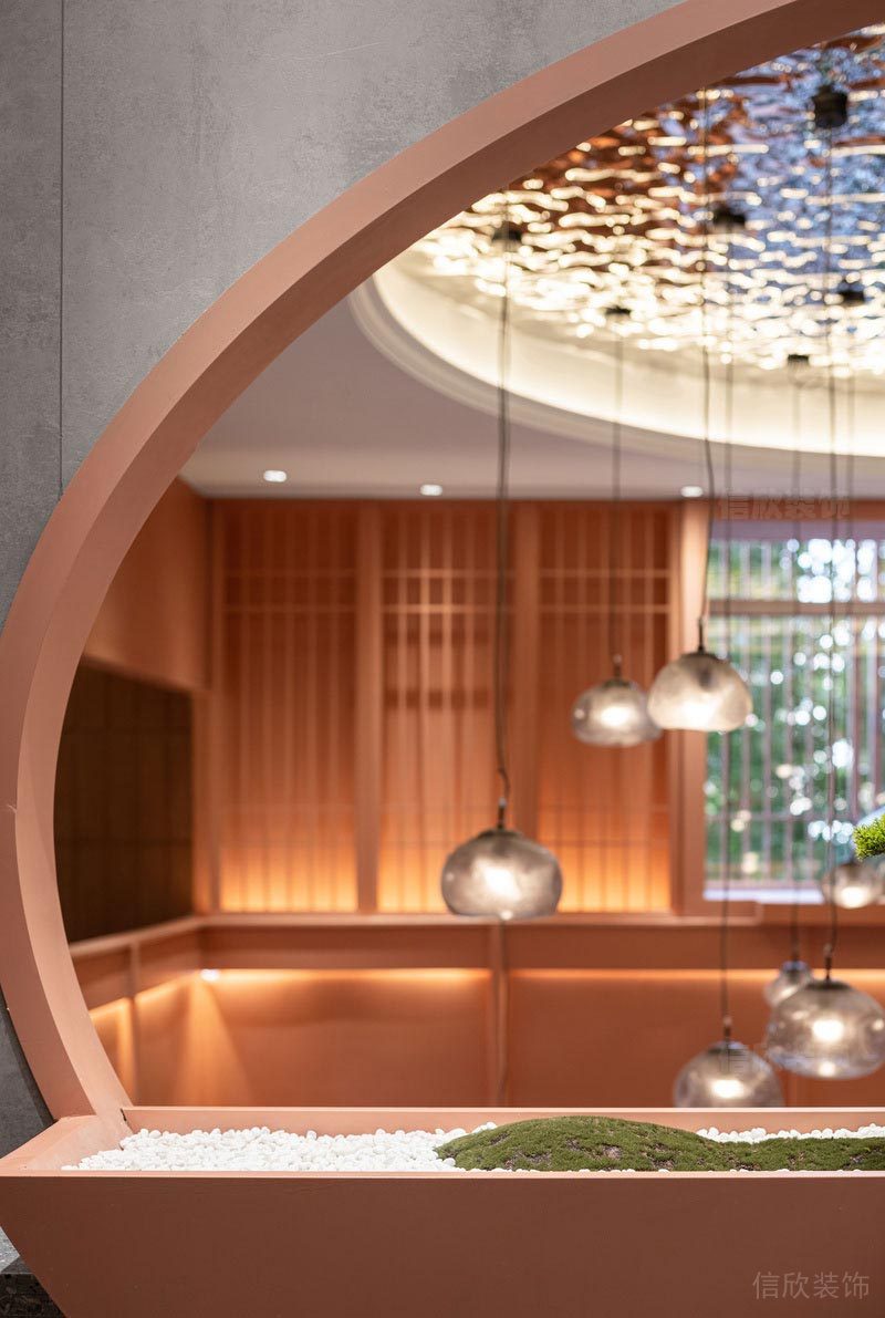 墻面上開了圓孔的隔墻,暗合天圓地方之意,開闊了視野,可以把陽光引進來,枯山水的綠植用餐之余,也是一道養(yǎng)眼的綠意。