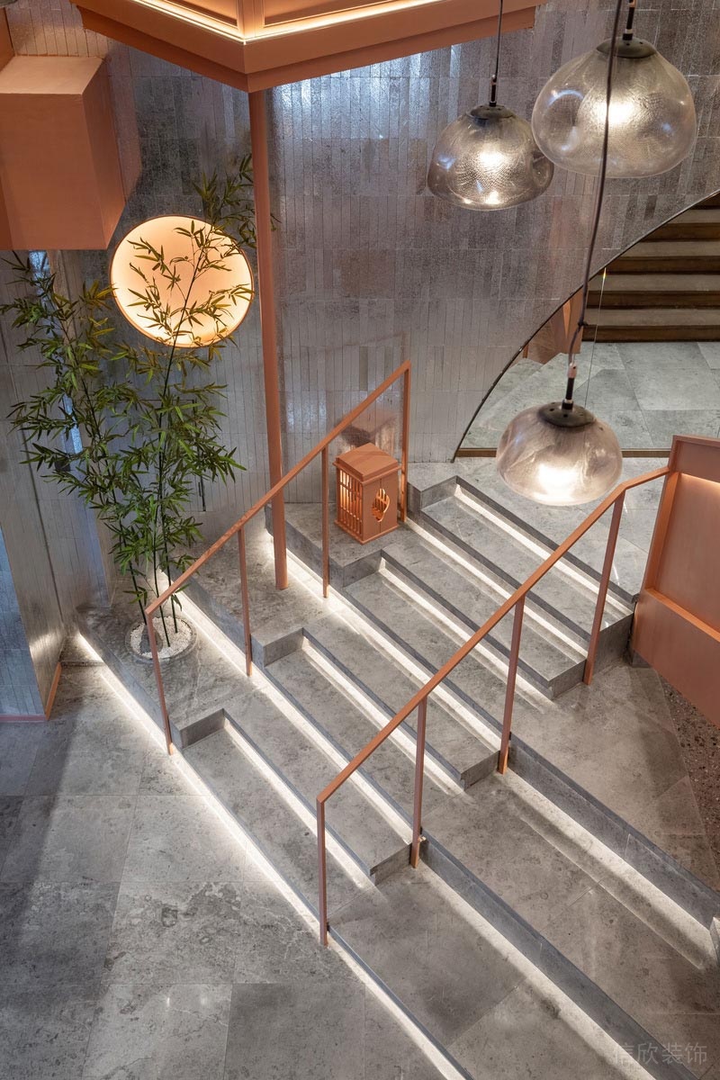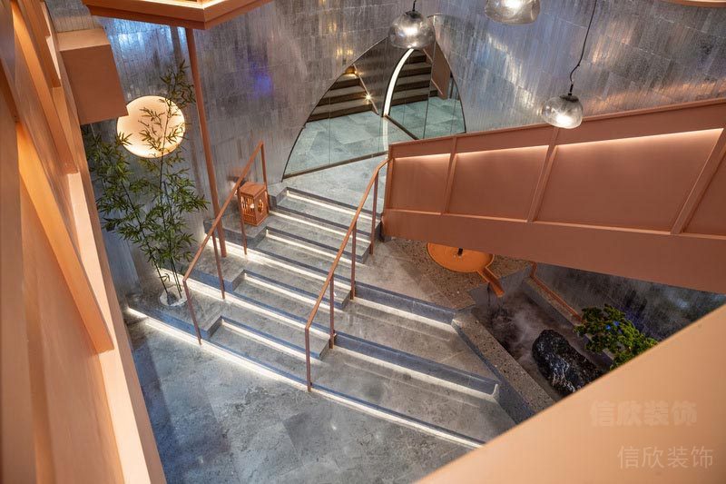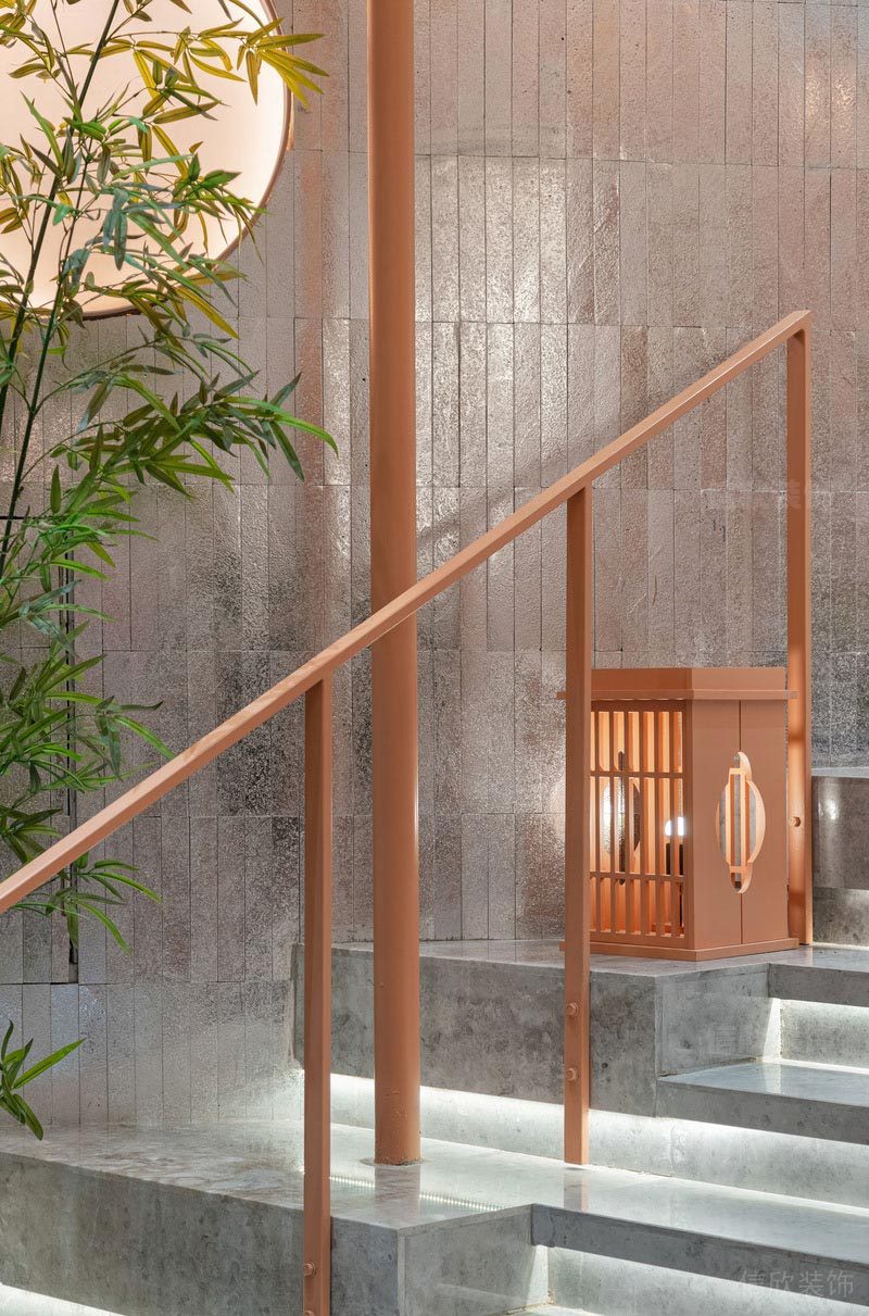 灰色的樓梯,在燈帶的裝點下,如山澗溪流在緩緩流淌,君子之風的瘦骨竹,在一輪明月的照耀下,如一副潑墨寫意的山水畫。