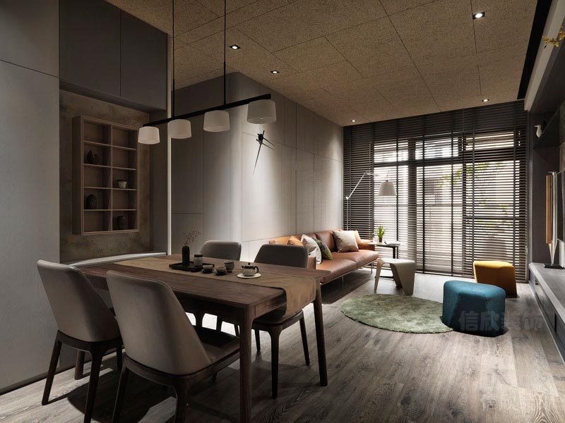 客餐廳一體式 的設(shè)計(jì),原木紋 的餐桌,燈光照耀下的壁龕,既是裝飾,又充滿(mǎn)了北歐般的節(jié)約浪漫情懷。