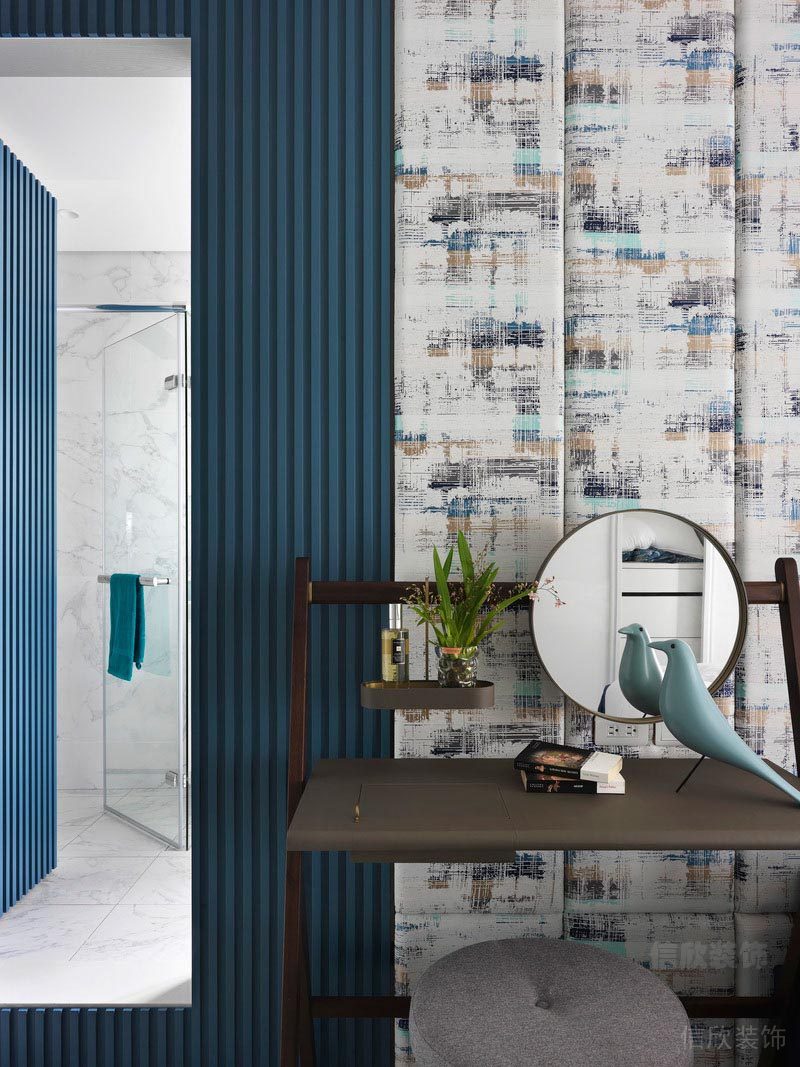 藍(lán)色調(diào)的現(xiàn)代簡(jiǎn)約臥室,抽象畫(huà)的背景,天鵝絨的軟床,如夢(mèng)幻一般的璀璨。