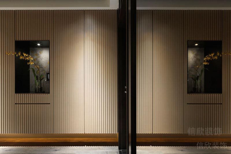 木藝邊框加抽象的壁紙,中間打上燈帶,隔板把上下空間一分為二,深邃而看見(jiàn)十足。
