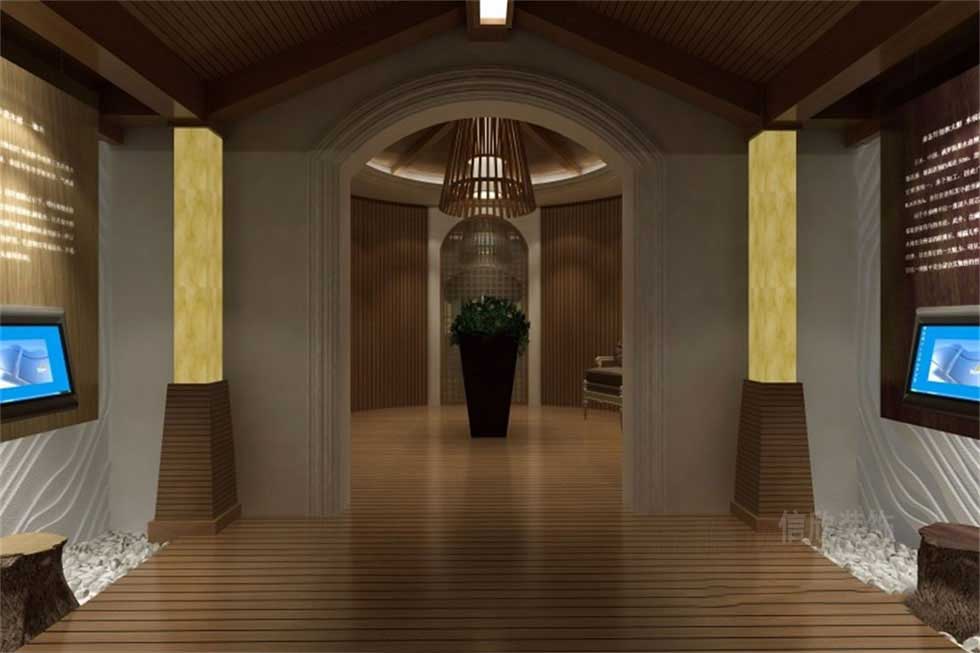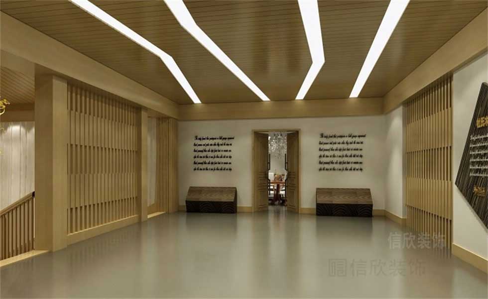二層延續(xù)整體的設(shè)計理念,暖黃色的墻面盡顯歲月的沉淀感,墻面和頂面原木一體式的格柵打造,不規(guī)則的曲線燈條放置,藝術(shù)的線條感裝點了自然的紋理特質(zhì)。