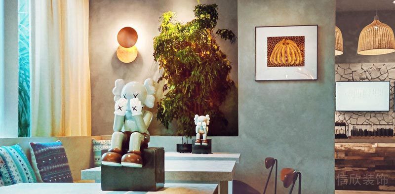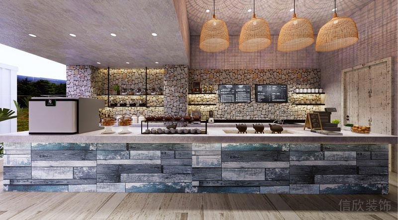 刻意做舊式的吧臺,展現(xiàn)出一種復(fù)古的韻味,天然人造石裂紋的背景墻,看起來很有文藝感,暖黃色人工編織的小吊燈,看起來溫馨文雅,看起來心里升起暖暖的感覺。-。