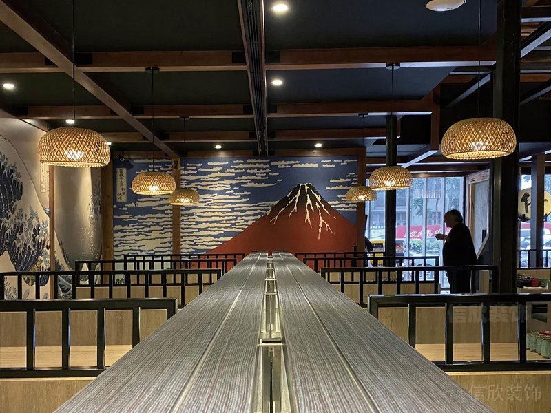 本壽司店一眼看上去給人的感覺,明亮開闊,木藝的量和長條原木桌的配合,空間延伸感很好,四周浮世繪海浪的壁紙,濃厚的日式風(fēng)情,而藤編的手工吊燈,為海浪的蒼涼,平舔了幾分溫馨。