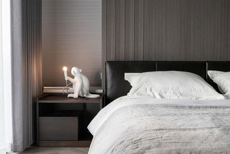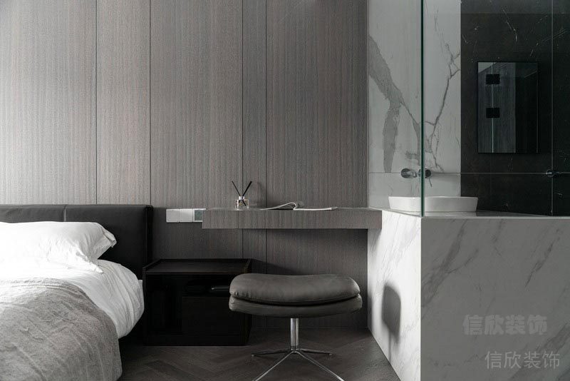 深色木紋飾面和淺色大理石紋的背景墻,簡單不繁雜,清爽,干凈。