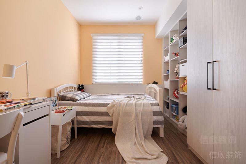 慵懶的黃色作為兒童房主色調(diào),白色而洋氣的小床,白色的衣柜,可自由調(diào)節(jié)明暗的百葉窗;讓孩子的心里永遠(yuǎn)保持一份最初的純真夢想。