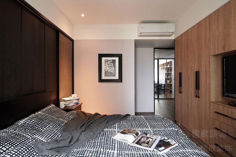 主臥采用了清澈白凈的墻面,深色木背景墻,淺色木衣柜搭配,色彩上有一定的過渡性和對撞之美;而又不在多余的地方做裝飾,保證了空間的合理性,和開放性。