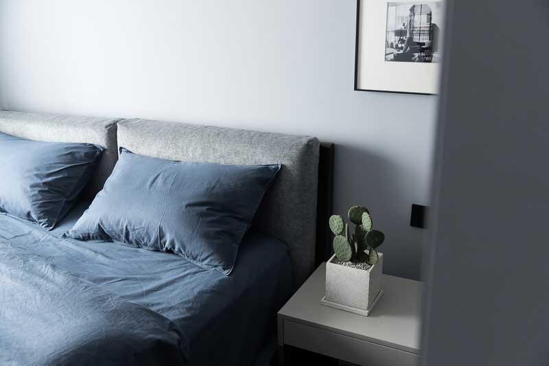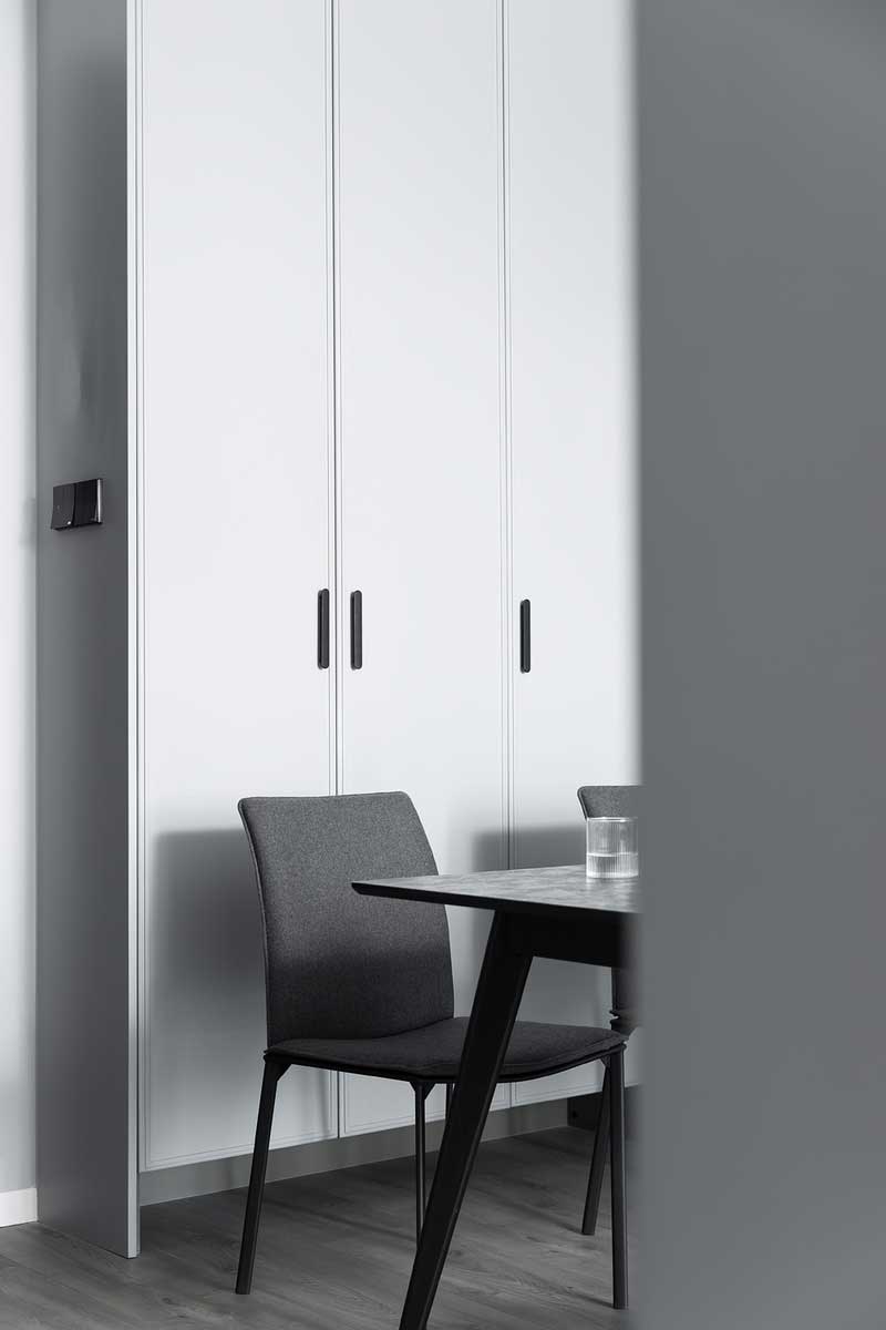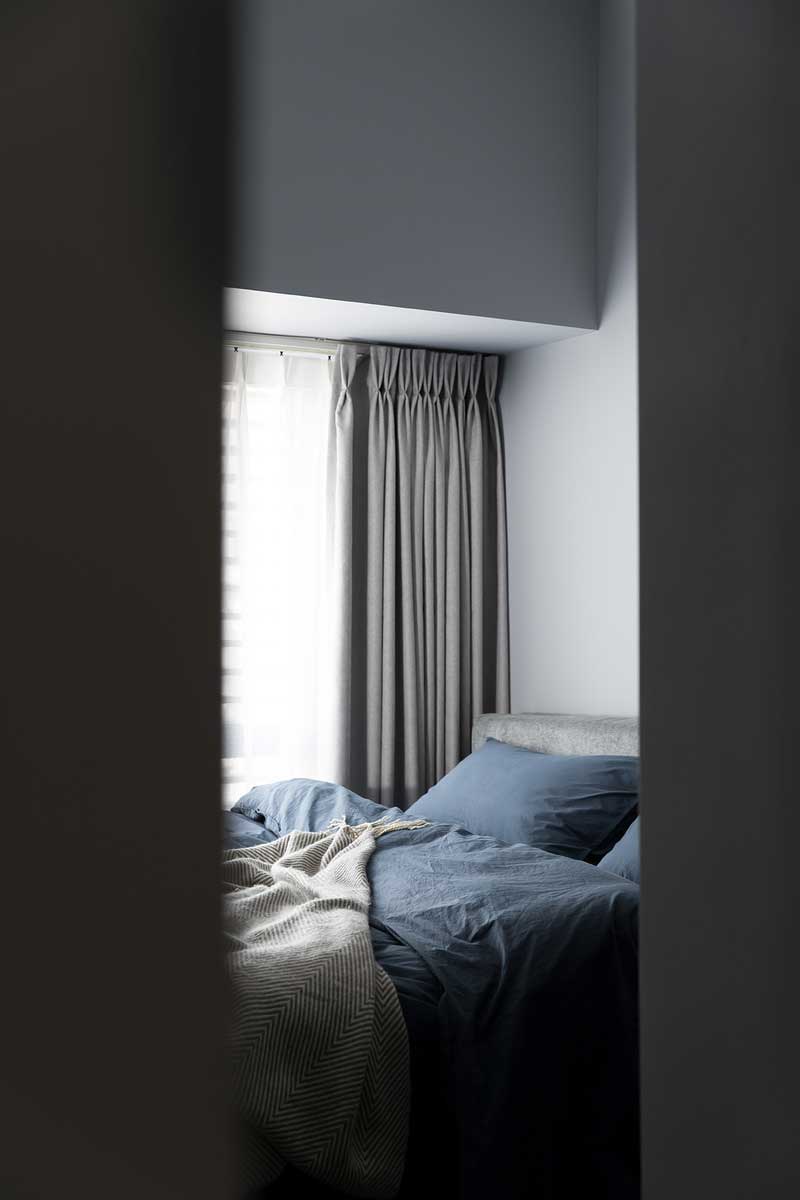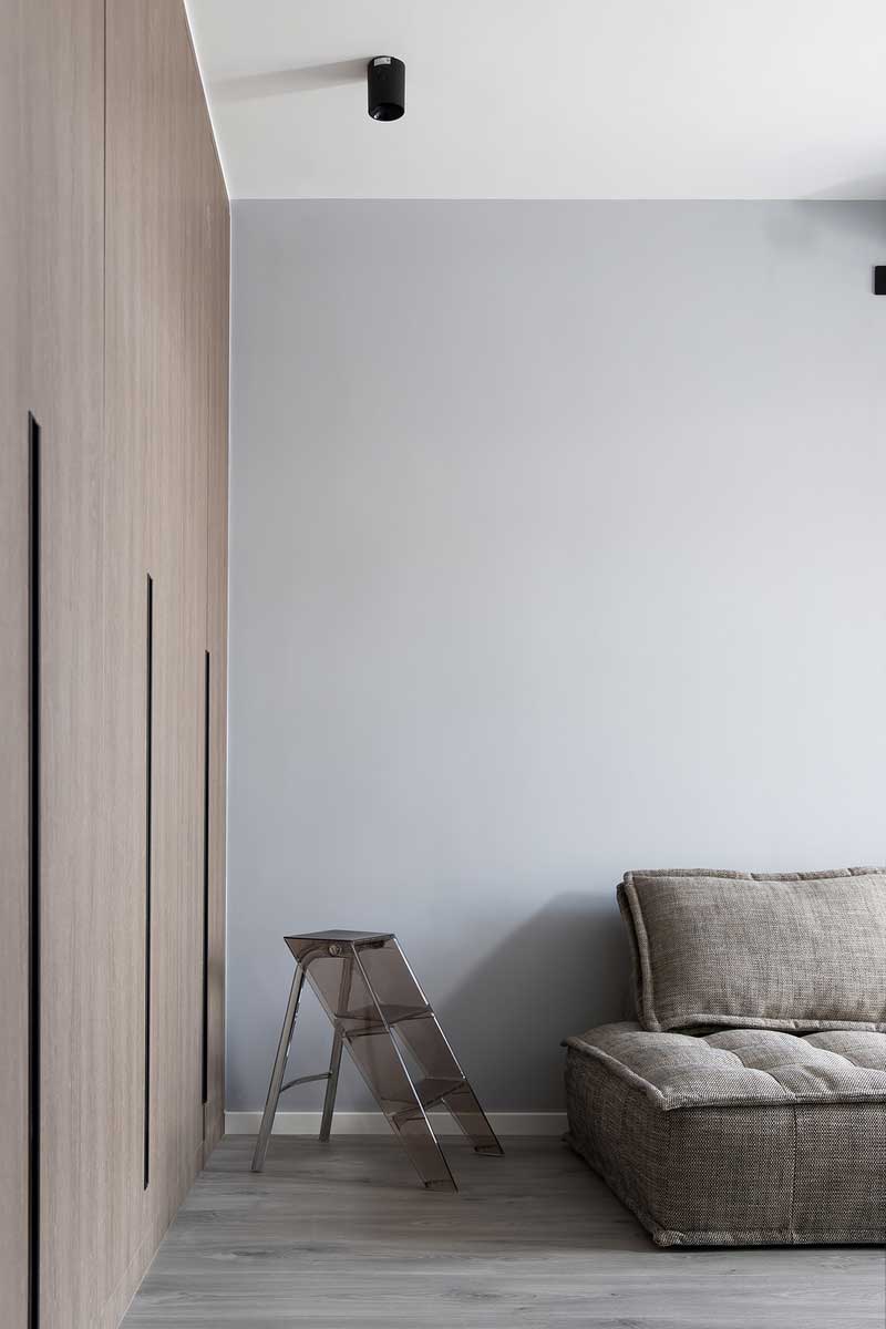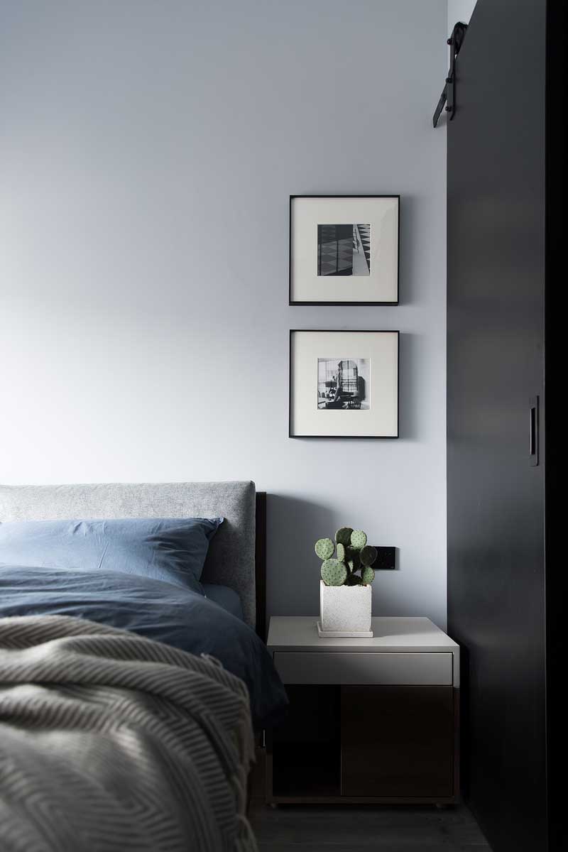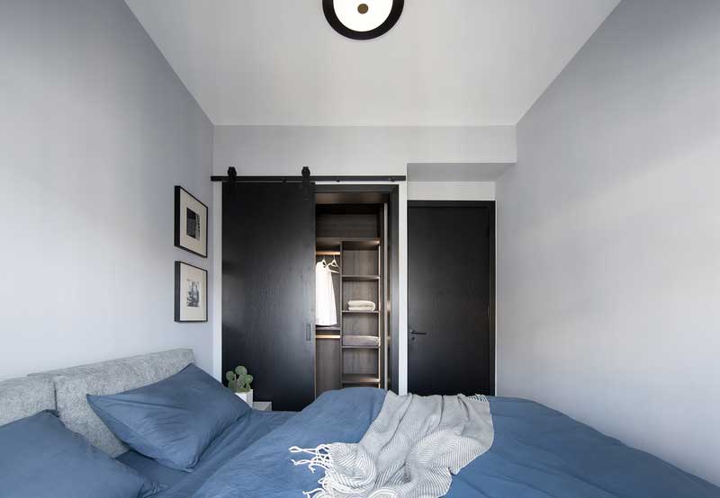 主臥設(shè)計依然強調(diào)簡單,直接的實用性,沒有設(shè)計吊頂和主燈,灰藍(lán)色的墻面,深色胡桃木的嵌入式衣柜,吊軌式的設(shè)計,給人一種簡單但充滿現(xiàn)代感的設(shè)計理念。