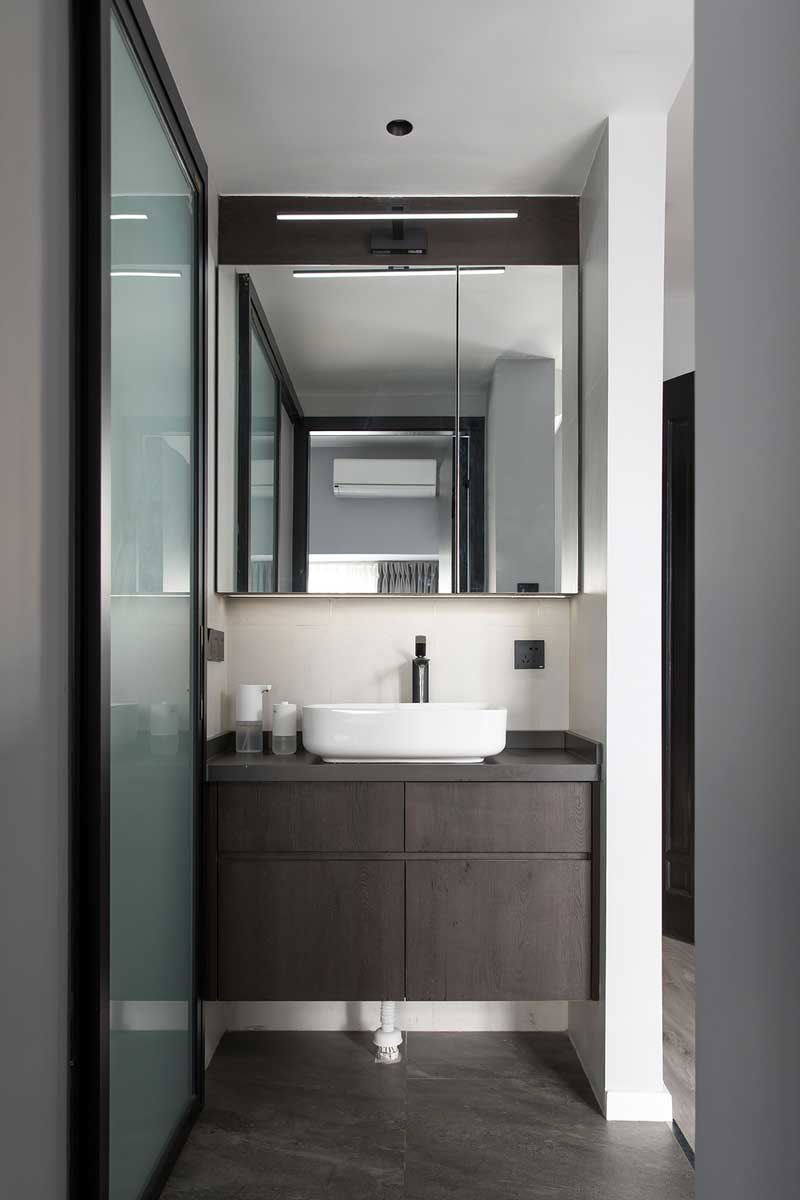 干濕分離的衛(wèi)生間,馬桶和玻璃隔斷的淋浴器在內(nèi)部,懸掛式壁柜放在外間的處理,不僅方便打理,不留衛(wèi)生死角,平時洗手也不需要進(jìn)去衛(wèi)生間,功能性更強。