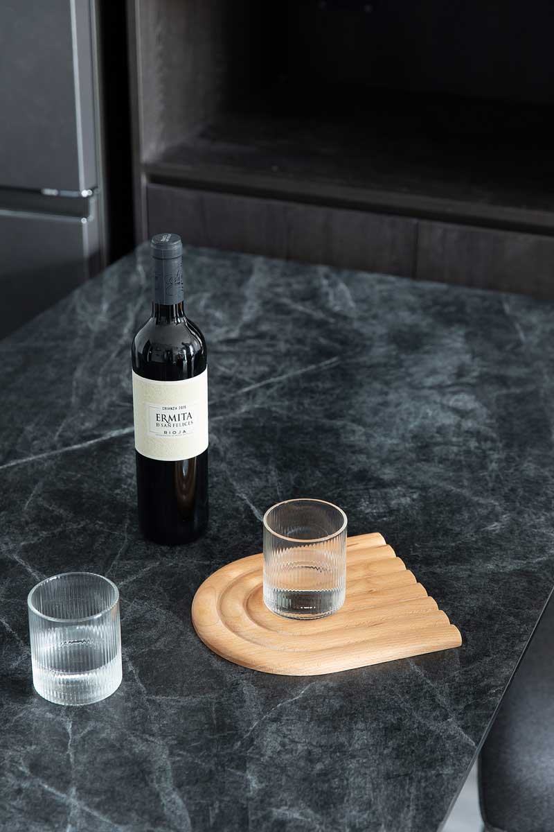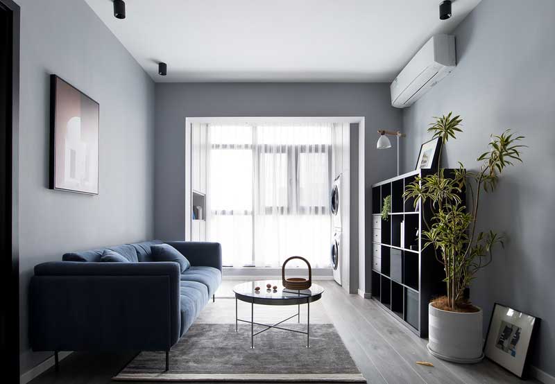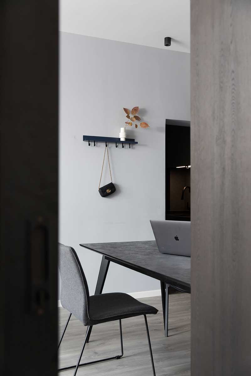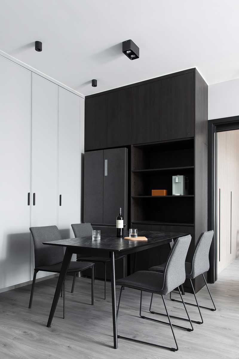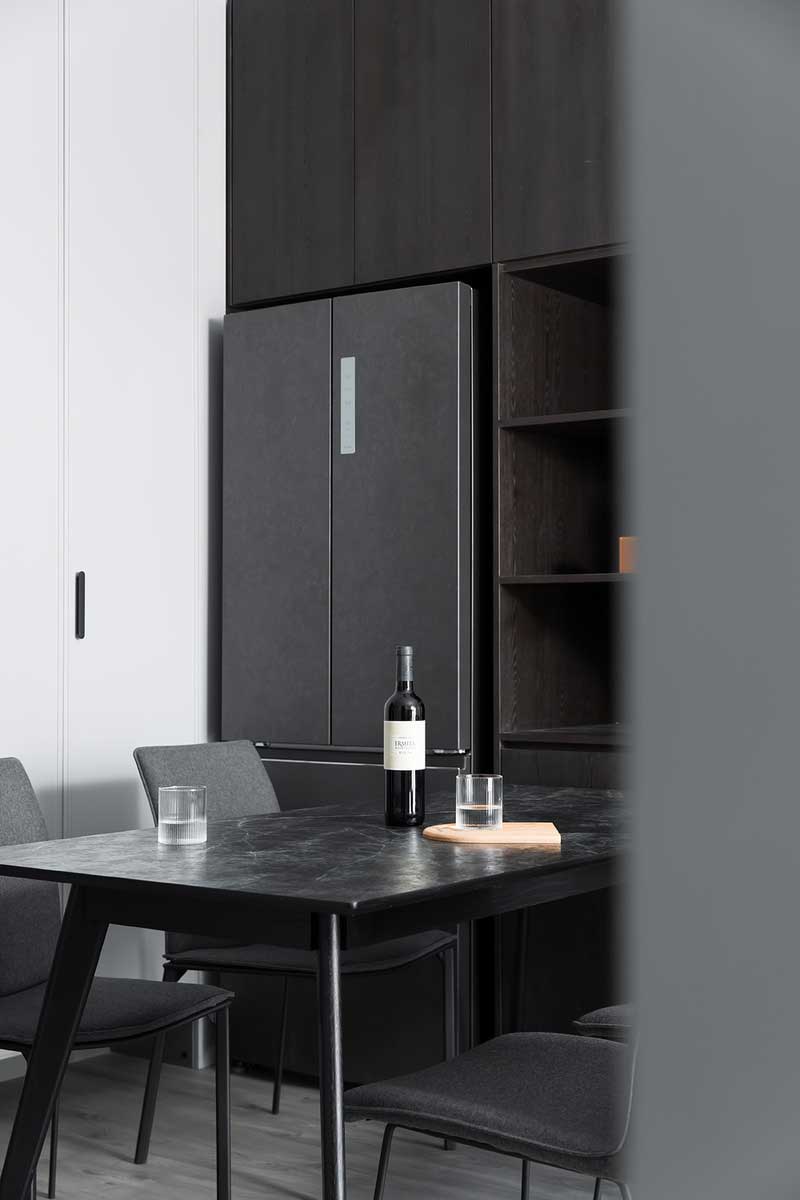 入戶位置,以淺藍(lán)色和黑色胡桃木的地板為主題基調(diào),這樣處理溫馨而時尚,為了空間功能性最大化,餐桌和冰箱柜一體式的設(shè)計,既不會站空間,使用起來更方便。