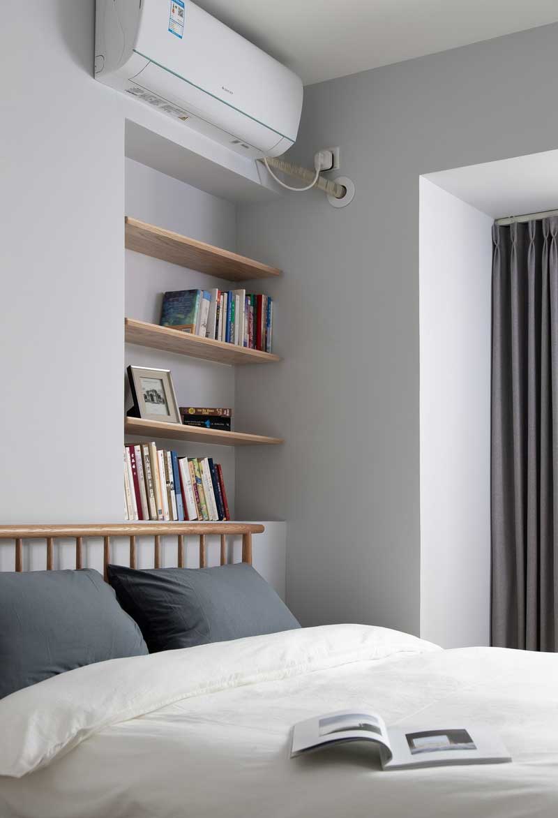 次臥的設(shè)計(jì)以灰藍(lán)色的大面積墻面應(yīng)用,提升整體的靈動(dòng)性,看起來色彩更活躍,利用拐角作為書架的設(shè)計(jì),這樣就可以滿足晚上睡前養(yǎng)成一個(gè)看書閱讀充實(shí)自己的好習(xí)慣。