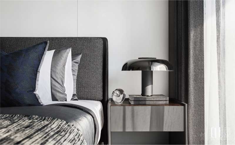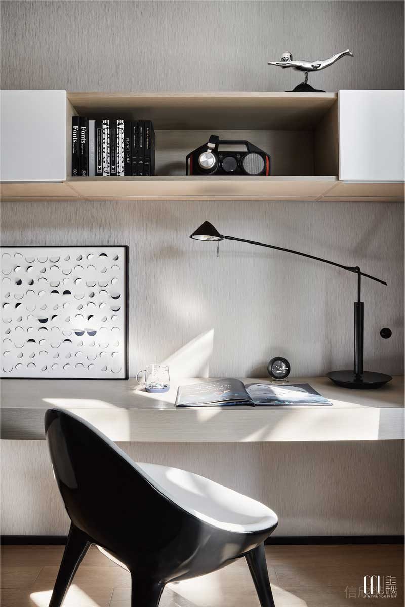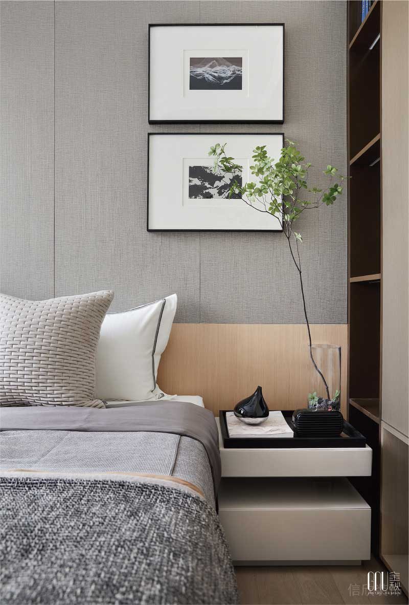 還原空間的本質(zhì),減少不必要的物件,純白的基調(diào)中卻潛藏著無(wú)限生機(jī),光與水的主題掛畫(huà)是臥室起居的生活映射,弱對(duì)比色調(diào)賦予歸巢從容而安的感受。