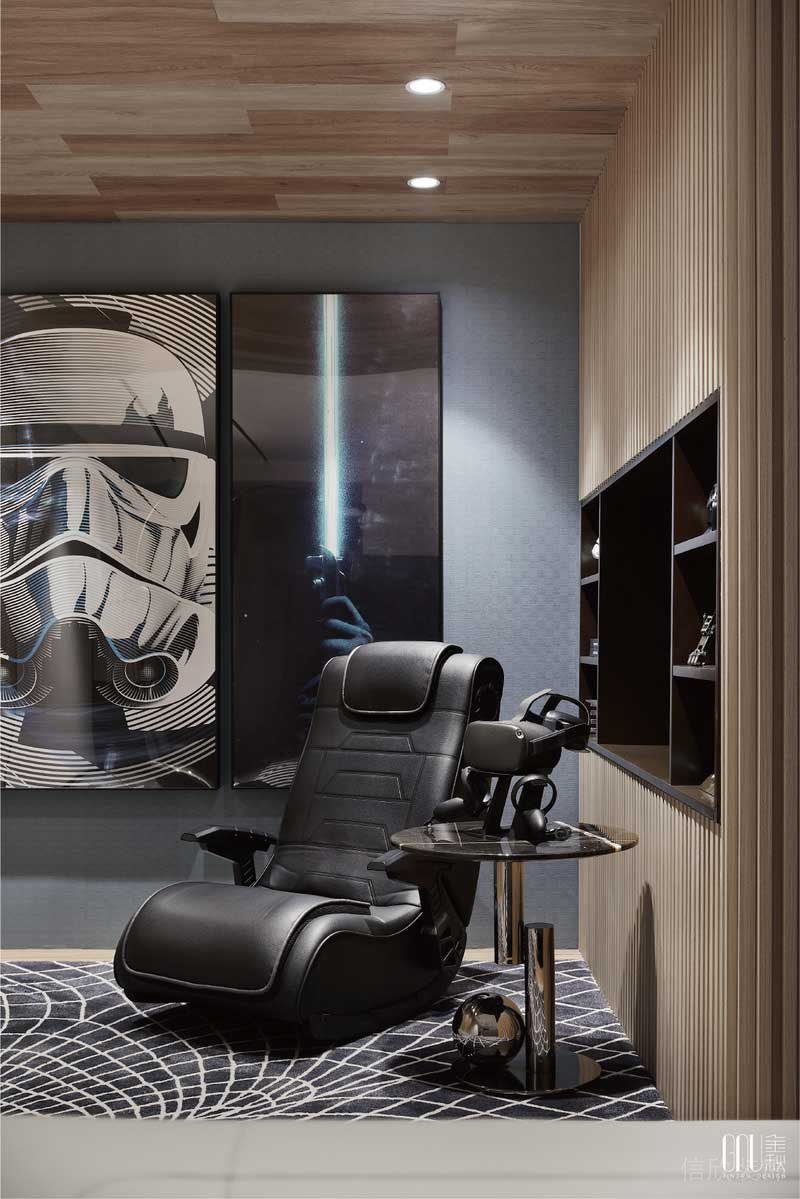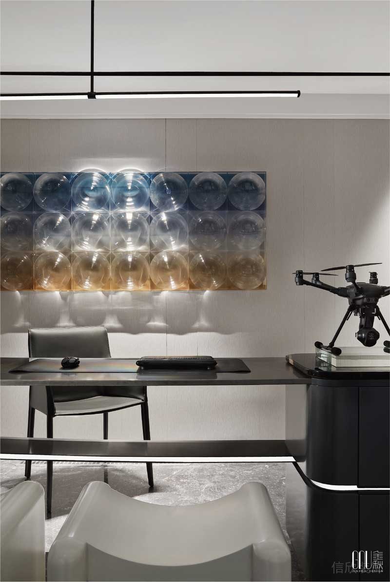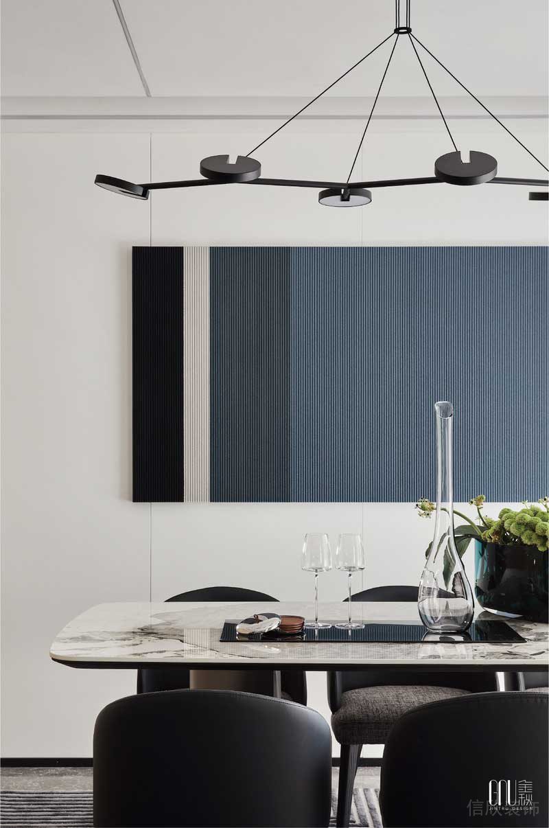 掛畫(huà)、地毯、沙發(fā)、均以延續(xù)性的線性提煉、創(chuàng)意性而簡(jiǎn)約的視覺(jué)造型、純粹的現(xiàn)代主義美學(xué)及精尚的質(zhì)感,是金秋設(shè)計(jì)一貫的設(shè)計(jì)語(yǔ)言。幾何重塑的形態(tài),在空間中演繹著歲月風(fēng)化的痕跡,賦予未來(lái)生活全新的視角。