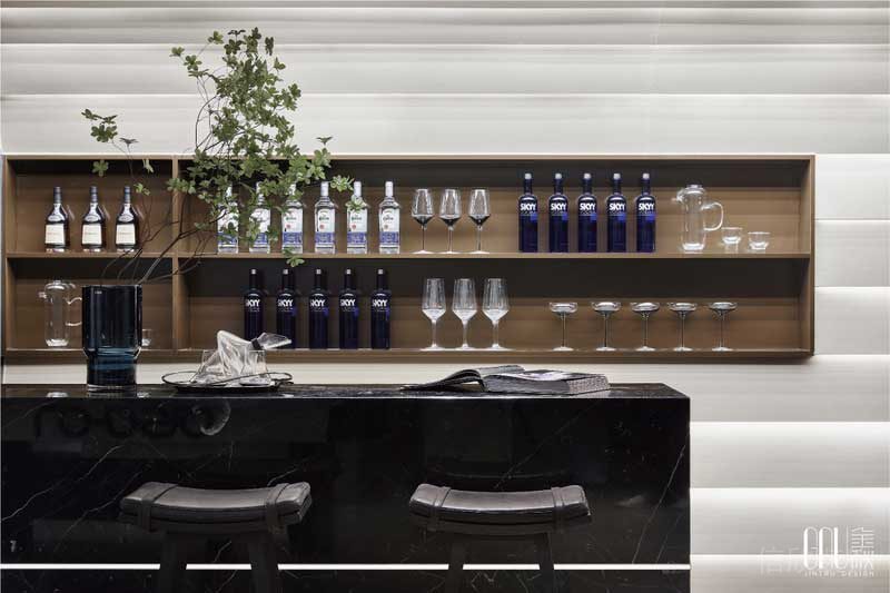 一整面墻體淺色系和深咖色結(jié)合的酒柜,在燈條的照射下,光影流動(dòng),奢華大氣,搭配黑色的高腳椅和吧臺(tái),身處家中可身邊流轉(zhuǎn)的是不遜于高端會(huì)所的奢華體驗(yàn),放松和休閑享受。