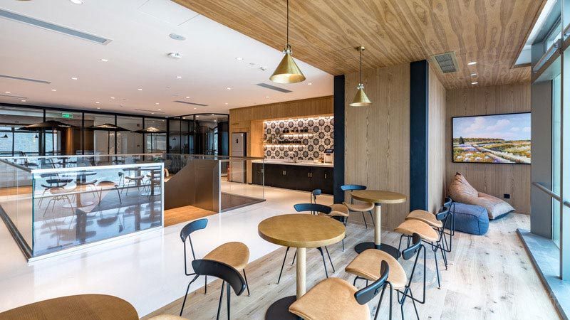 在墻面上大量使用玻璃墻,使空間的通透性強(qiáng),人們可以通過(guò)玻璃看到窗外的世界,使辦公空間與室外自然環(huán)境在一定程度上達(dá)到相互融合。同時(shí),室內(nèi)植物在陽(yáng)光的照射下形成自然的光影,對(duì)辦公空間有一定裝飾性。