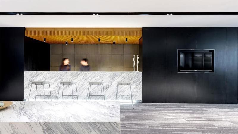 深圳市南山區(qū)辦公室吧臺 石材的冷艷和木藝格柵頂相結合,體現出一種簡約的雅致,工作之余,坐下來喝杯飲料,靜靜思考人生意義,自帶一份灑脫的氣質。