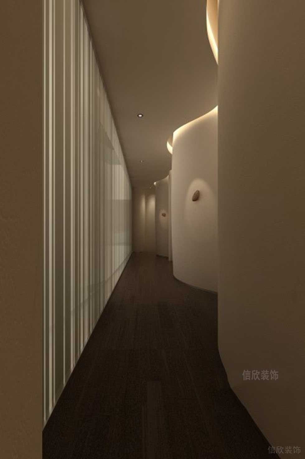 - 走廊的S型弧形走向,給人一種曲曲折折,蜿蜒而上的立體感,纖細(xì)修長(zhǎng)的頂面,加上昏暗光影的效果,用料和造型簡(jiǎn)單,但通過對(duì)比顯現(xiàn)出時(shí)尚,新穎和國際范感覺。