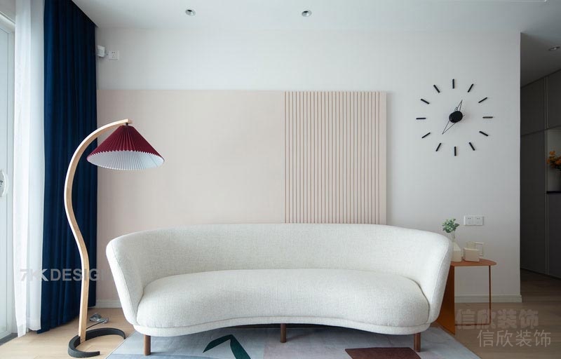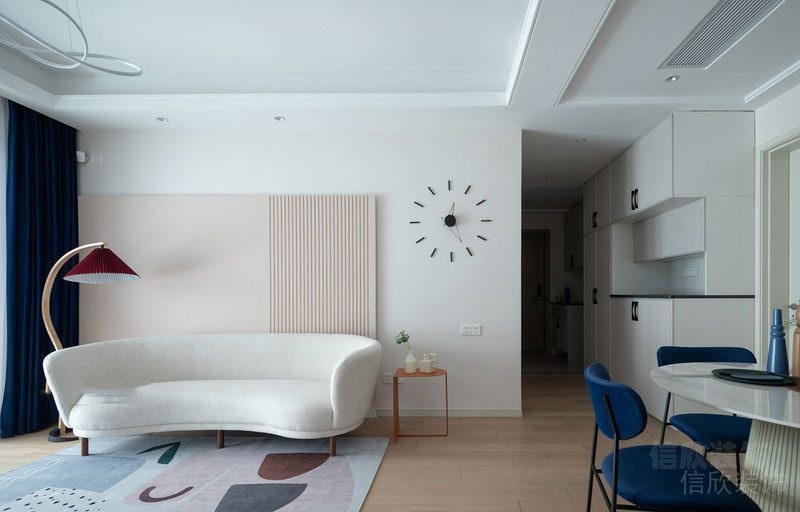 客廳整體延續(xù)餐廳白色的基底,粉色作為輔助色系,粉色是女業(yè)主比較喜歡的顏色,剛好孩子也是女兒,想打造清新浪漫的居家氛圍。
