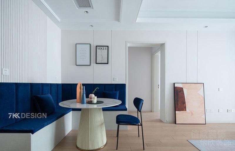 卡座的坐墊及后背選擇了藍(lán)色調(diào),大理石白色桌面加乳白色支撐的圓形餐桌,搭配同樣藍(lán)色系的餐椅。因?yàn)榧依镉行『ⅲ诓妥啦鸵渭吧嘲l(fā)等家具上都盡量選擇了弧形的元素,能讓空間減少直角的鋒利感,弧線(xiàn)讓空間感更柔軟。