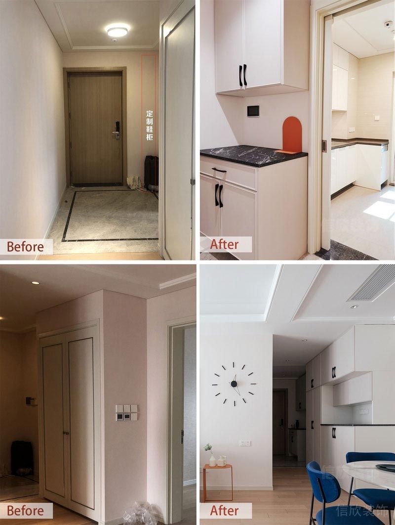 玄關(guān)裝修前后對(duì)比圖:進(jìn)門(mén)左側(cè)定制整體鞋柜,中間選擇鏤空設(shè)計(jì),方便放置進(jìn)出的物品、包包、鑰匙等。底下懸空,方便拖鞋常用鞋子的擺放,也方便清理空間。鞋柜延伸進(jìn)來(lái)拆除原有的柜體重新定制和鞋柜同材質(zhì)的柜體,使得空間更整體,收納更合理。