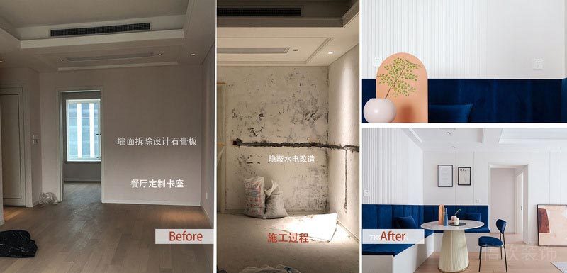 餐廳裝修前后對(duì)比:精裝房設(shè)計(jì)中,首先需要思考的是效果和資金規(guī)劃之間的平衡。本案考慮業(yè)主的預(yù)算及需求情況,保留了原始硬裝格局,將墻面材質(zhì)拆除,重新用石膏板材質(zhì)設(shè)計(jì)背景墻,既滿(mǎn)足了美觀(guān)性,又節(jié)省了刷乳膠漆的基礎(chǔ)工序。由于整個(gè)餐廳空間面積有限,選擇卡座餐廳節(jié)省空間,卡座下面設(shè)計(jì)收納空間增加儲(chǔ)藏。