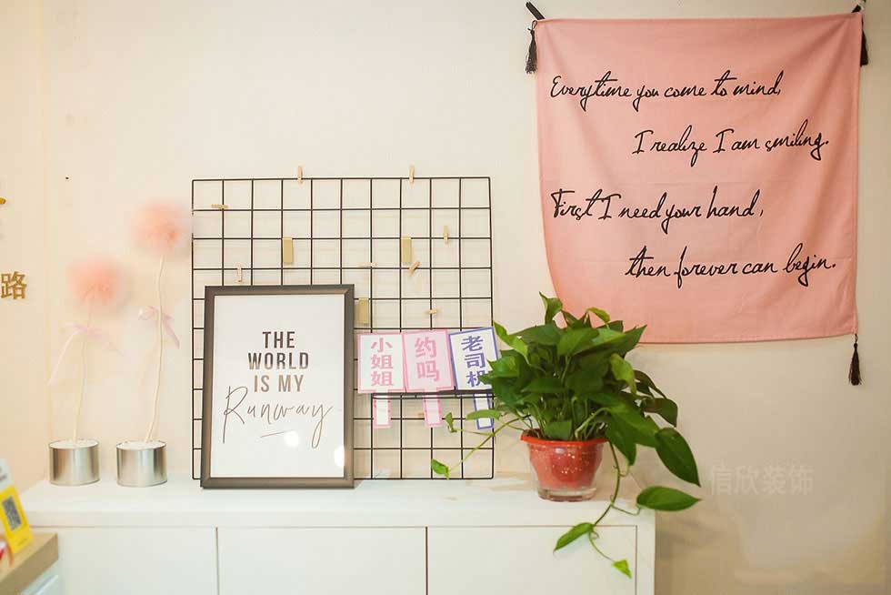 在設(shè)計上充分考慮商業(yè)空間的獨特性,美甲店消費群體主要為追求時尚與美麗的女生??臻g則以店鋪logo金色為主色,粉紅色飾物作為點綴,粉紅的火烈鳥、粉紅的抱枕和掛旗……都能為顧客帶來美的享受。