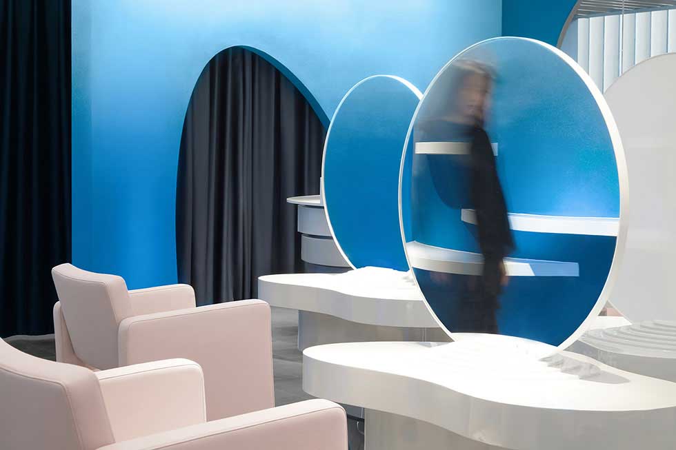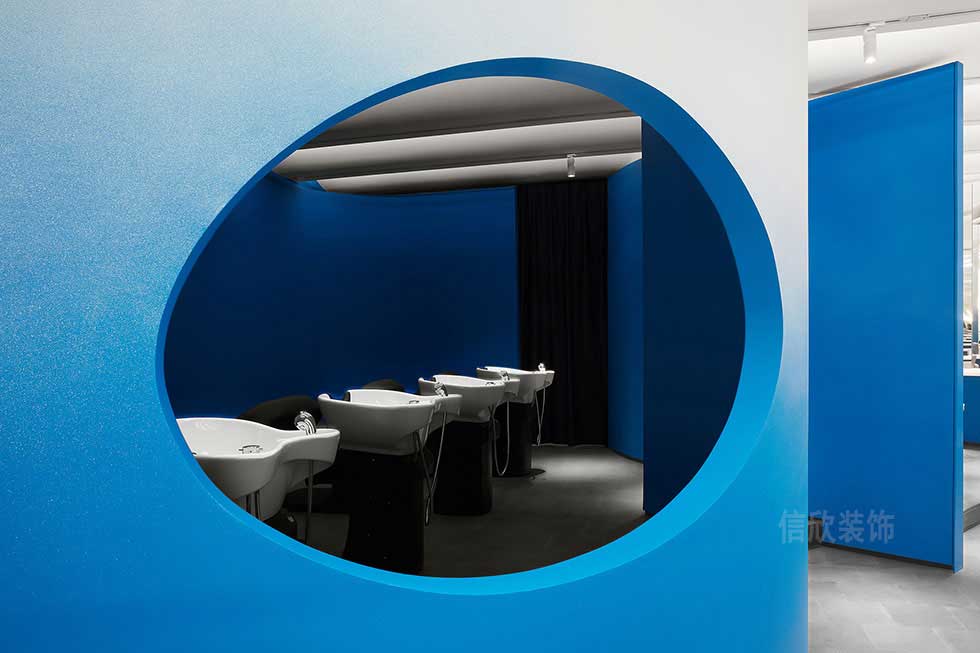 美容院室內(nèi)具有柔和的弧形墻面,覆以藍(lán)白的漸變效果,身處其中,仿佛置身于海霧和海浪之中。這些弧形墻面將整個(gè)空間以流暢的方式連接起來(lái),并在確保空間開(kāi)放性的前提下,將美容院空間分成了不同的區(qū)域,以便在小區(qū)域內(nèi)進(jìn)行各種服務(wù)和活動(dòng)。