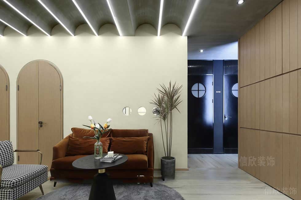 拱形吊頂與水泥色的組合,多了一點(diǎn)溫柔;搭配上條形燈光,空間上更具躍動(dòng)感與層次感。