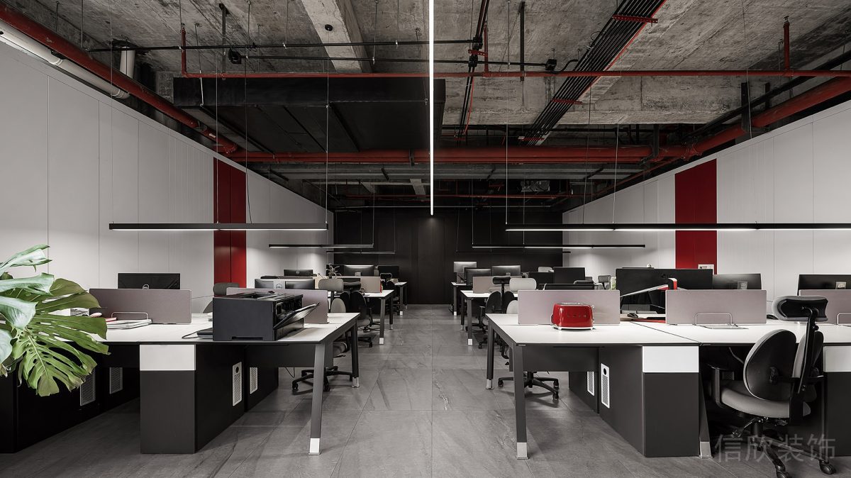 辦公區(qū)裝修設(shè)計(jì)大面積采用白色,吊頂做局部古銅色裝飾,地面用褐色和灰色水磨石區(qū)分過道和辦公區(qū)空間。