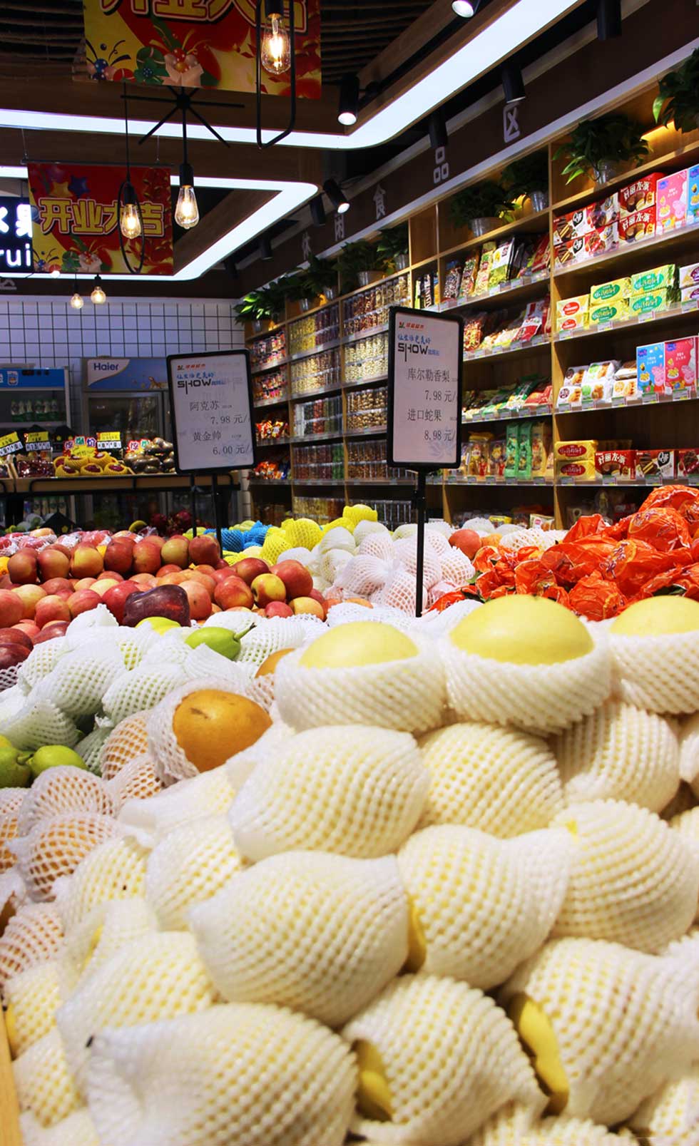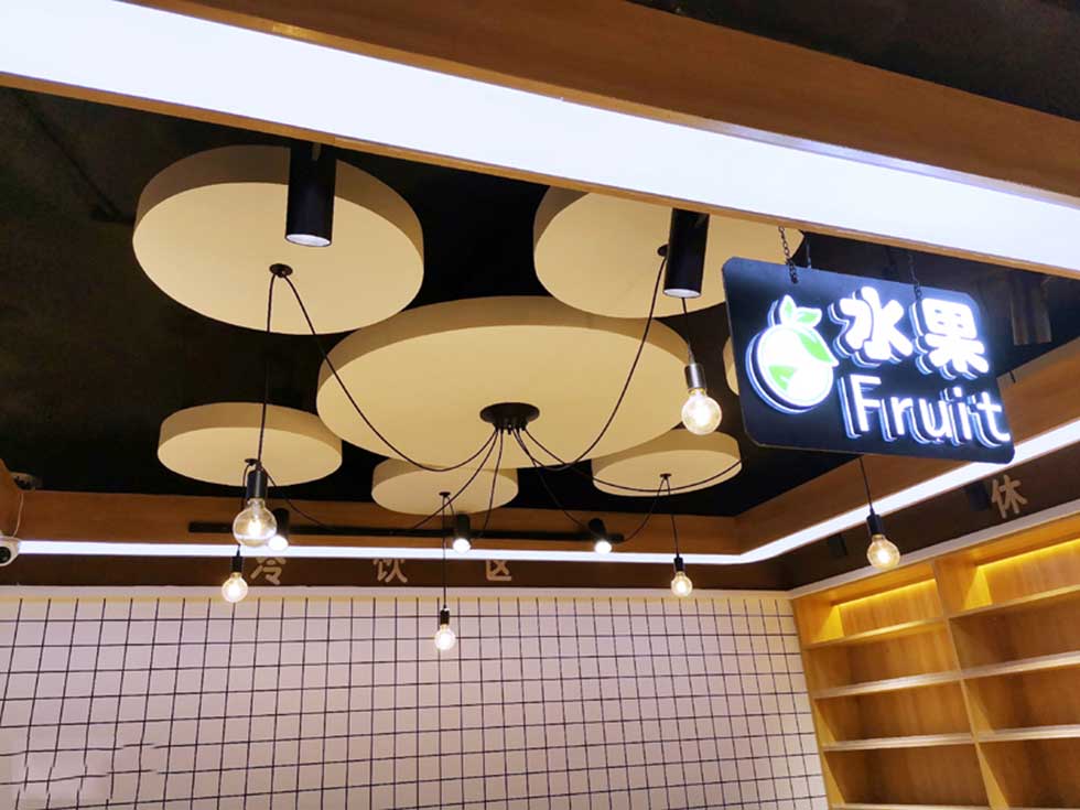 水果店頂面的裝修,保留了原始的結(jié)構(gòu),用噴黑的處理方式,入戶利用燈眉降低了層高,給人感覺藝術(shù)飽滿而不顯得空曠,麻繩組成的格柵頂面,新穎大膽,充滿手工藝術(shù)的氣閥。