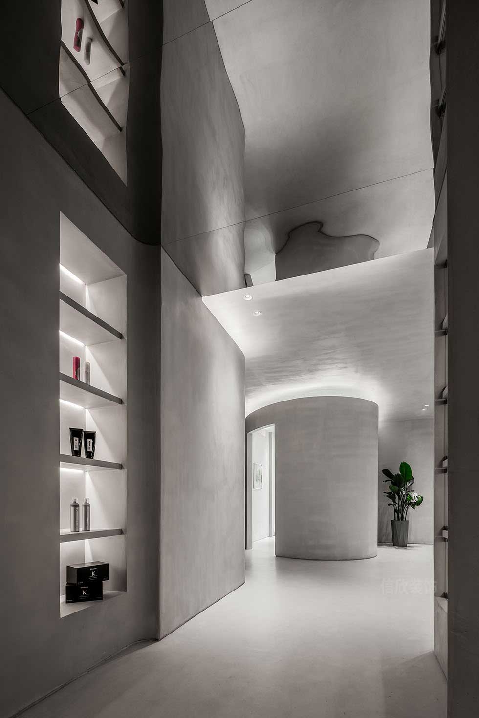 通過對(duì)“形”與“色”的對(duì)比、交疊、碰撞、拼接、組合,找到了微妙的平衡感,也賦予了空間無窮的可能性。設(shè)計(jì)將細(xì)膩的水流與光影變化納入其中,分隔精細(xì)的收納架讓美發(fā)、護(hù)發(fā)的產(chǎn)品有了便捷清晰的收納,同時(shí)裝點(diǎn)了空間。