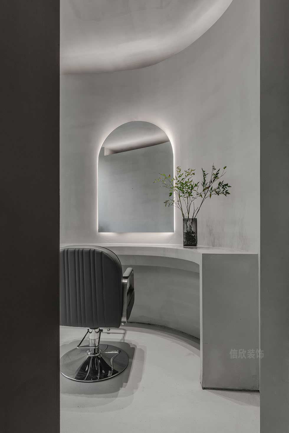 設(shè)計(jì)再次展現(xiàn)了自然與室內(nèi)的無邊之界,漫長(zhǎng)的造型時(shí)間難免枯燥無聊,巧妙的設(shè)計(jì)恰好可以為時(shí)光增添生趣?;【€形的操作臺(tái)讓每位客人都暢通無阻地欣賞到戶外風(fēng)景。在等待的間隙給眼睛放個(gè)假,也為心靈安排了一段愜意的旅行。