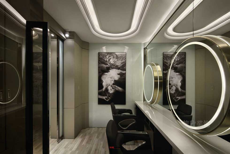 設(shè)計(jì)師認(rèn)為,設(shè)計(jì)作品應(yīng)該和人產(chǎn)生互動(dòng),讓人情感得以滿足,空間與人之間不一樣的互動(dòng),造就了不一樣的空間魅力。在燈光的處理上,理發(fā)區(qū)域的造型燈帶,銅材質(zhì)的圓環(huán)型吊燈兼顧了兩邊座位的燈光需求。和VIP區(qū)域的鏡前燈也形成了呼應(yīng),強(qiáng)調(diào)細(xì)節(jié)的同時(shí)也不失整體的協(xié)調(diào)。