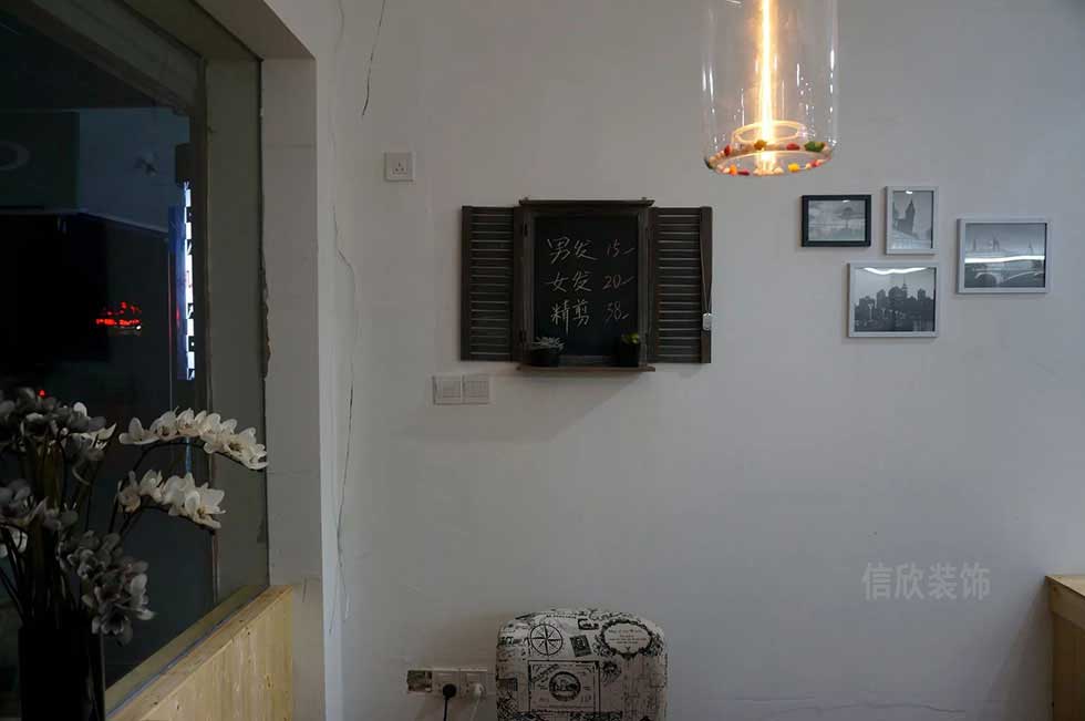 美發(fā)店大廳的裝修設計,采用混合型的風格理念,保持原始建筑風格的基礎上,直接刮白和軌道吊燈的應用,簡潔明了,富有工業(yè)感的氣息,整體實木地板和家具,顯示出溫馨的一面。