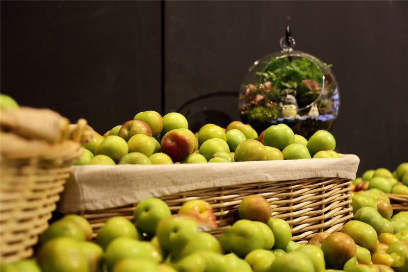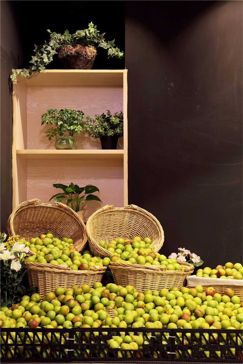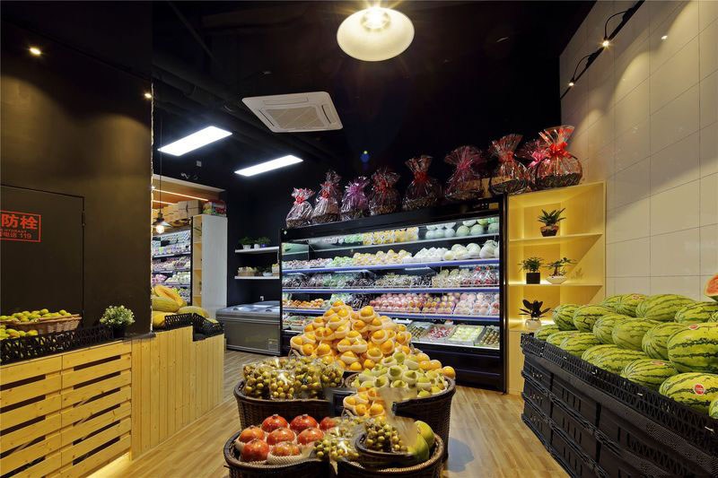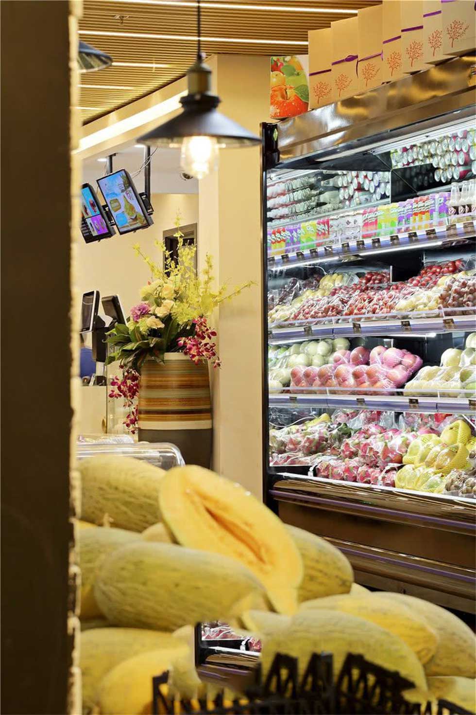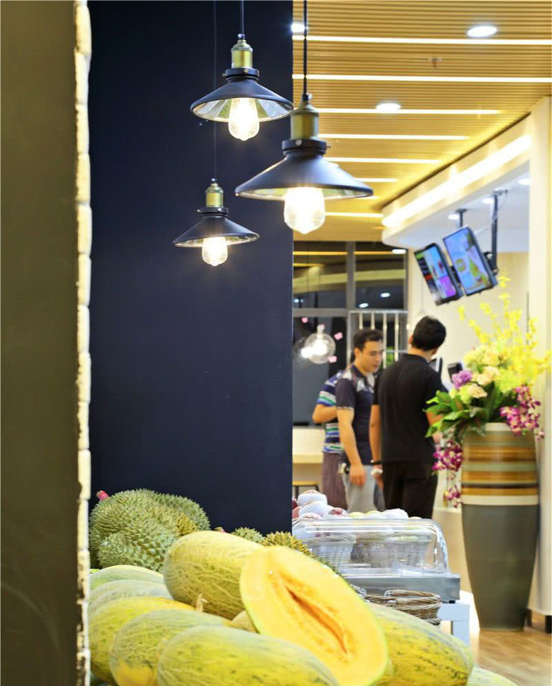 原結構的頂面噴黑處理,摒棄了復雜的設計方式,注重其經濟,環(huán)保,實用價值,白色文化石磚墻,各種新鮮水果的中島臺和保鮮柜,保證店里的水果一直新鮮和美味。