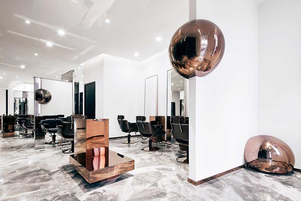 ▼理發(fā)區(qū)概覽,雕像裝置為美發(fā)空間注入靈動的藝術氣息